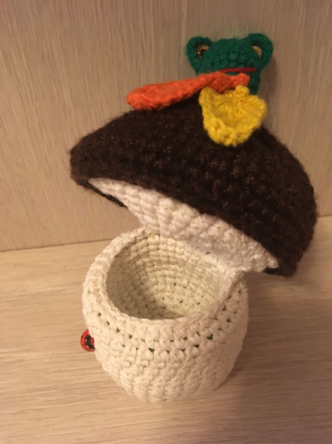 تم تحريك ساق الفطر من الخيط البيج الفاتح وفقًا للمخطط بالنسبة للغطاء ، يجب أن تأخذ غزلًا بنيًا ، يتم منه حياكة الدائرة وفقًا للمخطط مع انخفاضات في الصفوف الأخيرة من أجل التقريب الجميل. يمكن تزيين القبعة بمضرب من نفس الغزل أو إظهار خيال بربط الأوراق والتوت.