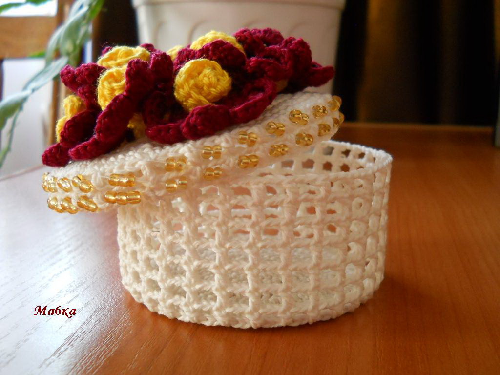 صناديق الكروشيه المخرمة الجميلة بشكل غير عادي مع المخططات والأوصاف. الميزة الخاصة بهم هي عدم وجود إطار. وهي نشوية أو منقوعة بشراب السكر ، وبعد ذلك تصبح قوية وتحافظ على شكلها.