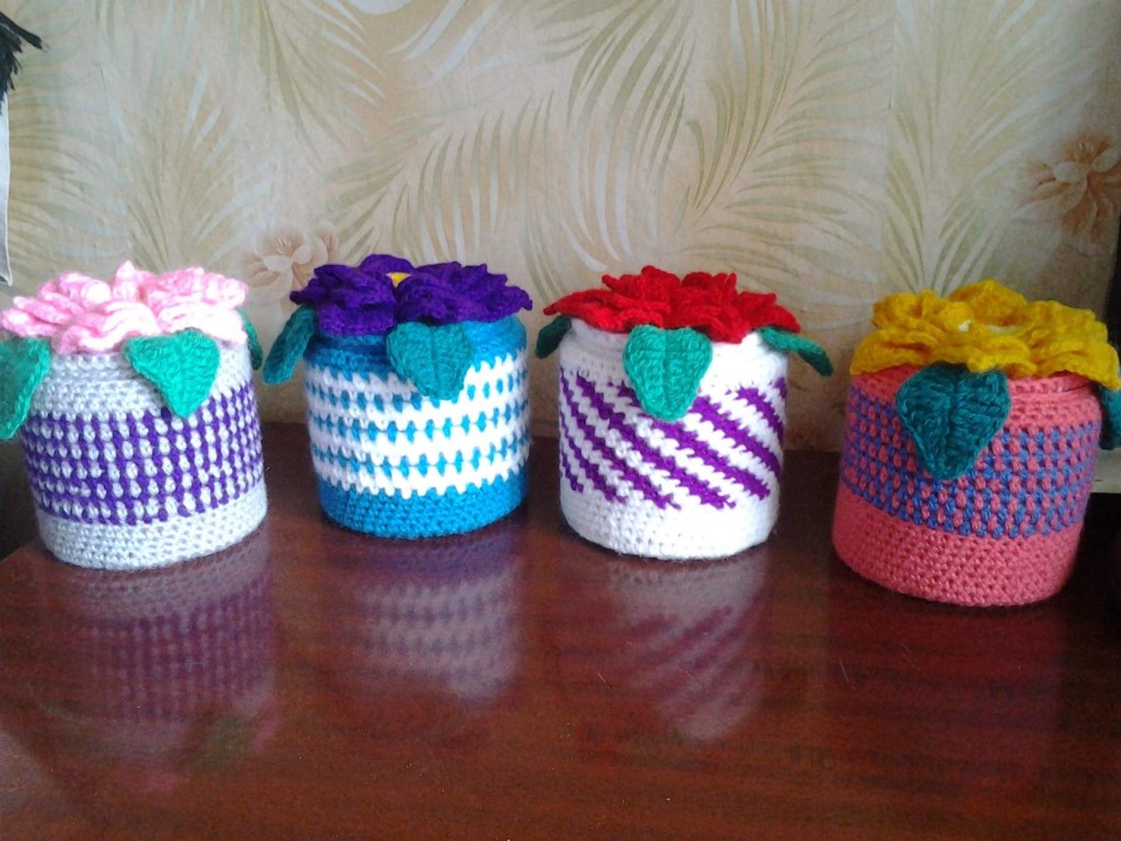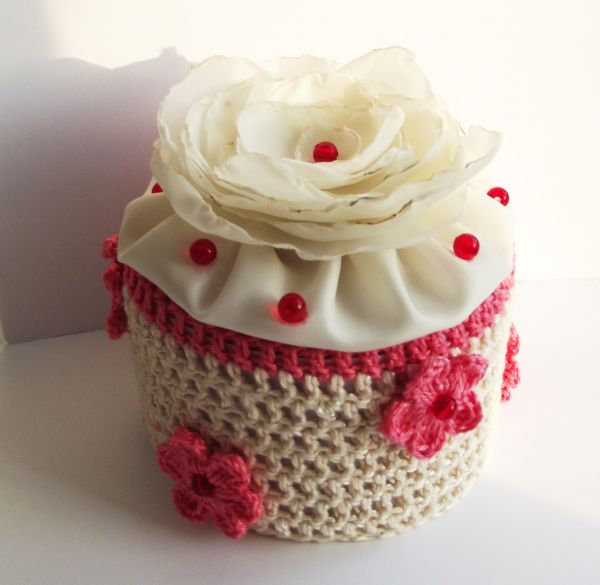 بالمناسبة! بالنسبة للصناديق المحبوكة ، يمكنك أن تأخذ أي أواني الشكل المناسبة: من كريم التجميل ، وأغذية الأطفال ، والقهوة ، والشاي. يمكن تغيير الوعاء الزجاجي العادي بشكل كبير عن طريق الحياكة ، بحيث لا يشك أحد في حاوية قياسية في منتج تريكو أنيق.