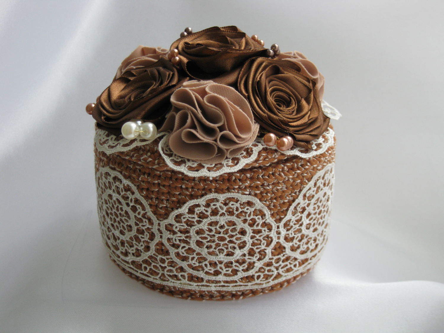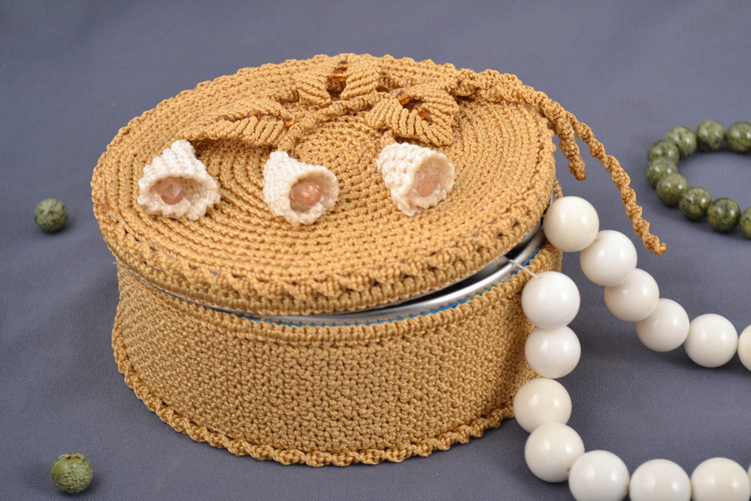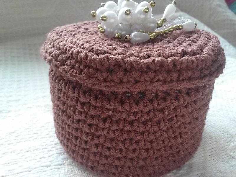 - في عملية الحياكة لصندوق دائري مع الكروشيه ، لا تنس أن تجرب حرفتك على جرة ، والتحقق من الحجم وتحديد مقدار العمل اللاحق.