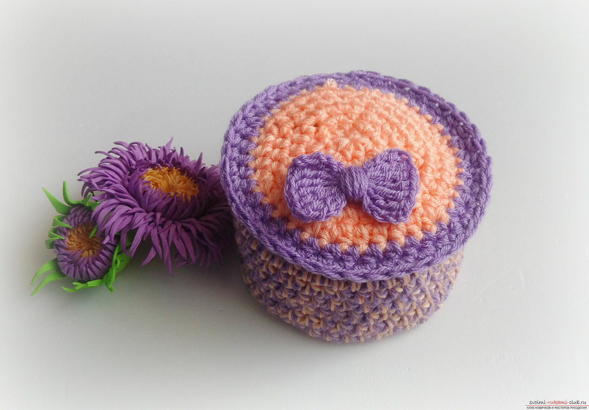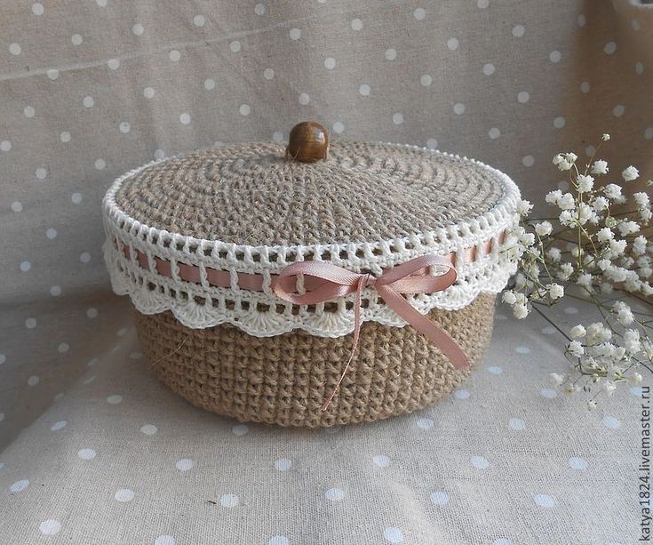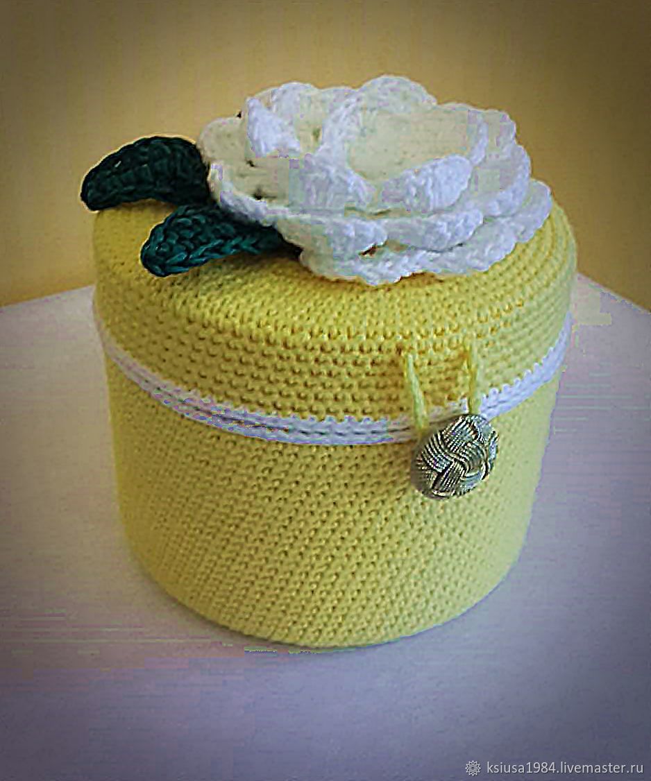من الأفضل أن تجرب يدك من صناديق الكروشيه المحبوكة المستديرة. لهذا تناسب أي جرة بلاستيكية ، على سبيل المثال ، من كريم. حسب الحجم ، ستكون هناك حاجة إلى 30-50 جم من الخيط ، الخطاف رقم 2.5 أو 3.