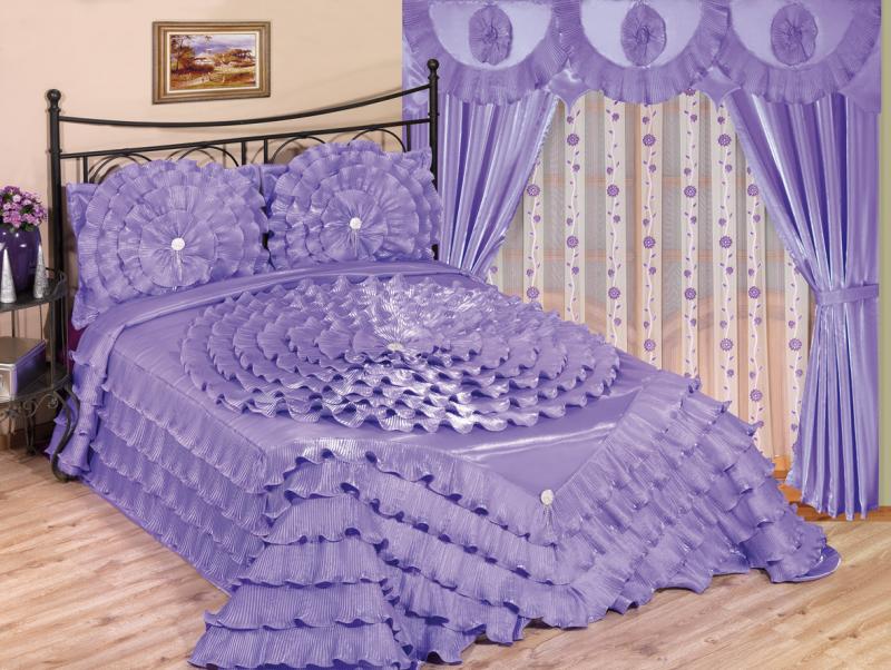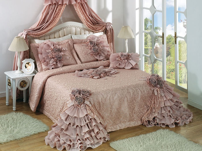 غطاء مزين بزخارف مختلفة (شرائط ، دانتيل ، نفث ، هدب) يمنح الغرفة راحة لا تصدق ، يخلق جواً رومانسياً. في الوقت نفسه ، تؤدي وفرة مكونات النسيج في الجزء السفلي وظيفة عملية - تخفي إطار السرير.