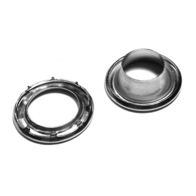 في الثقوب المعدة مسبقًا على القماش المشمع على كلا الجانبين ، مقابل بعضهما البعض ، يتم وضع كتلة وخاتم ، وبعد ذلك يتم تثبيتهما بشكل آمن على المواد بمساعدة من التوهج والمطرقة.