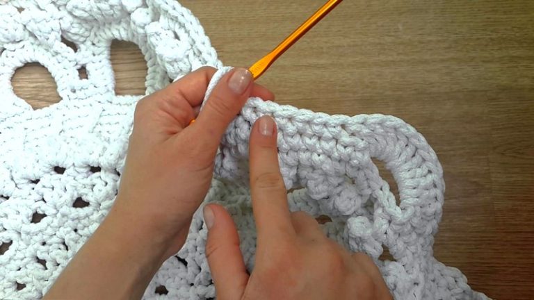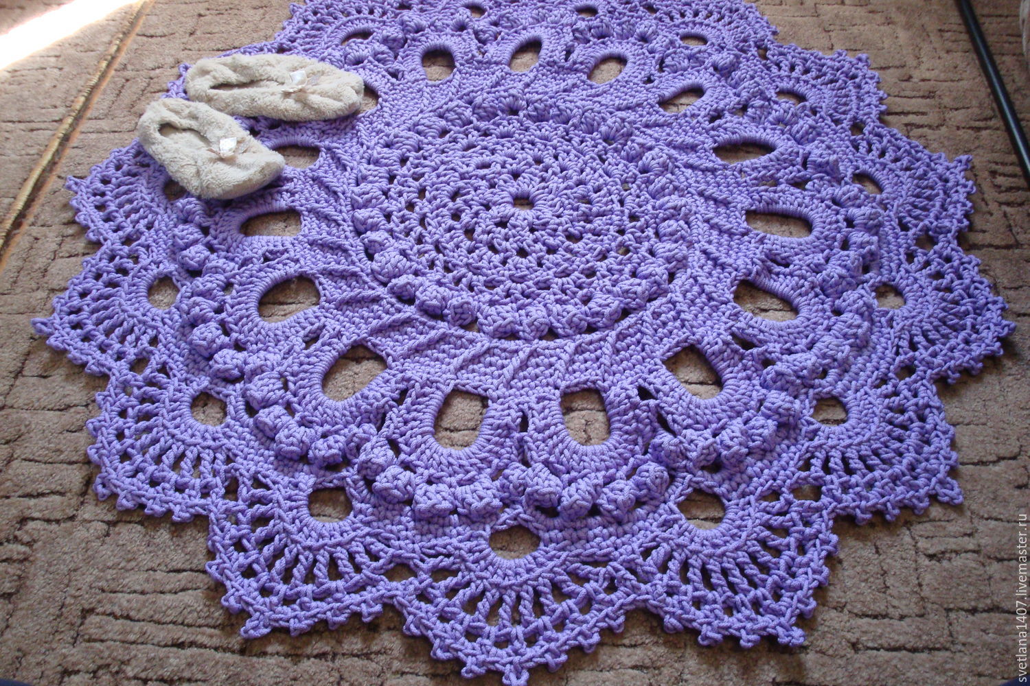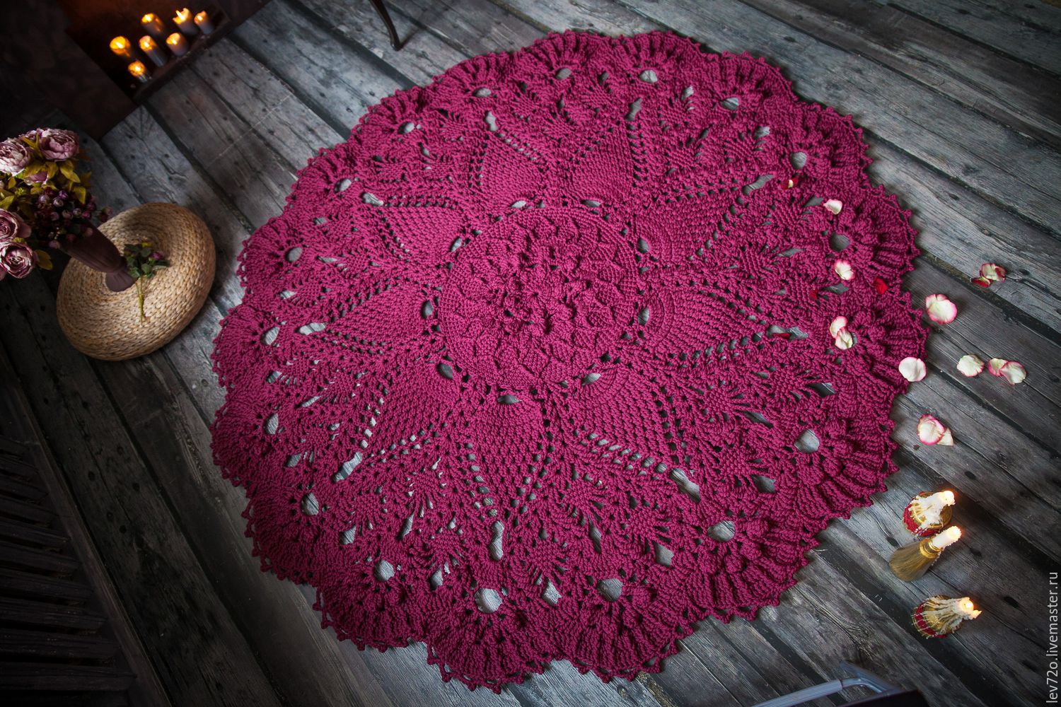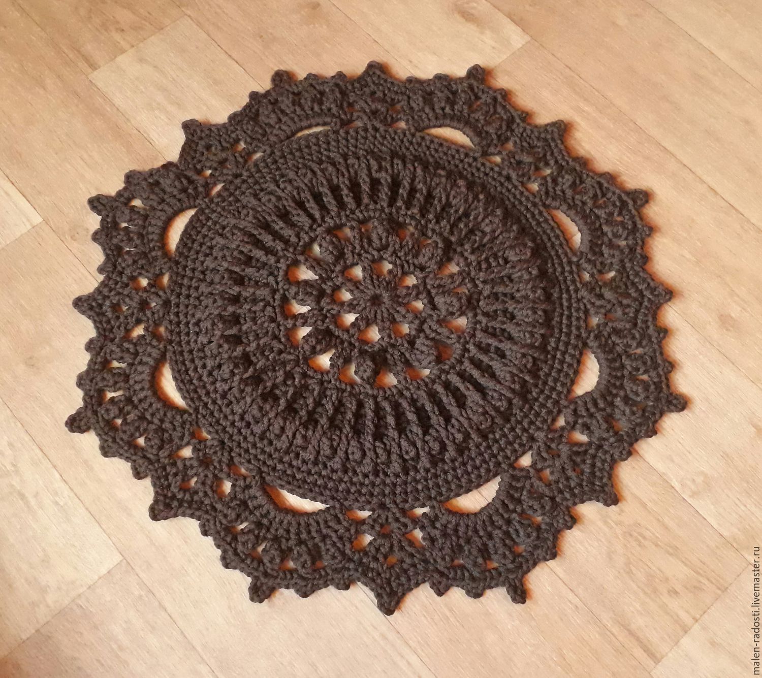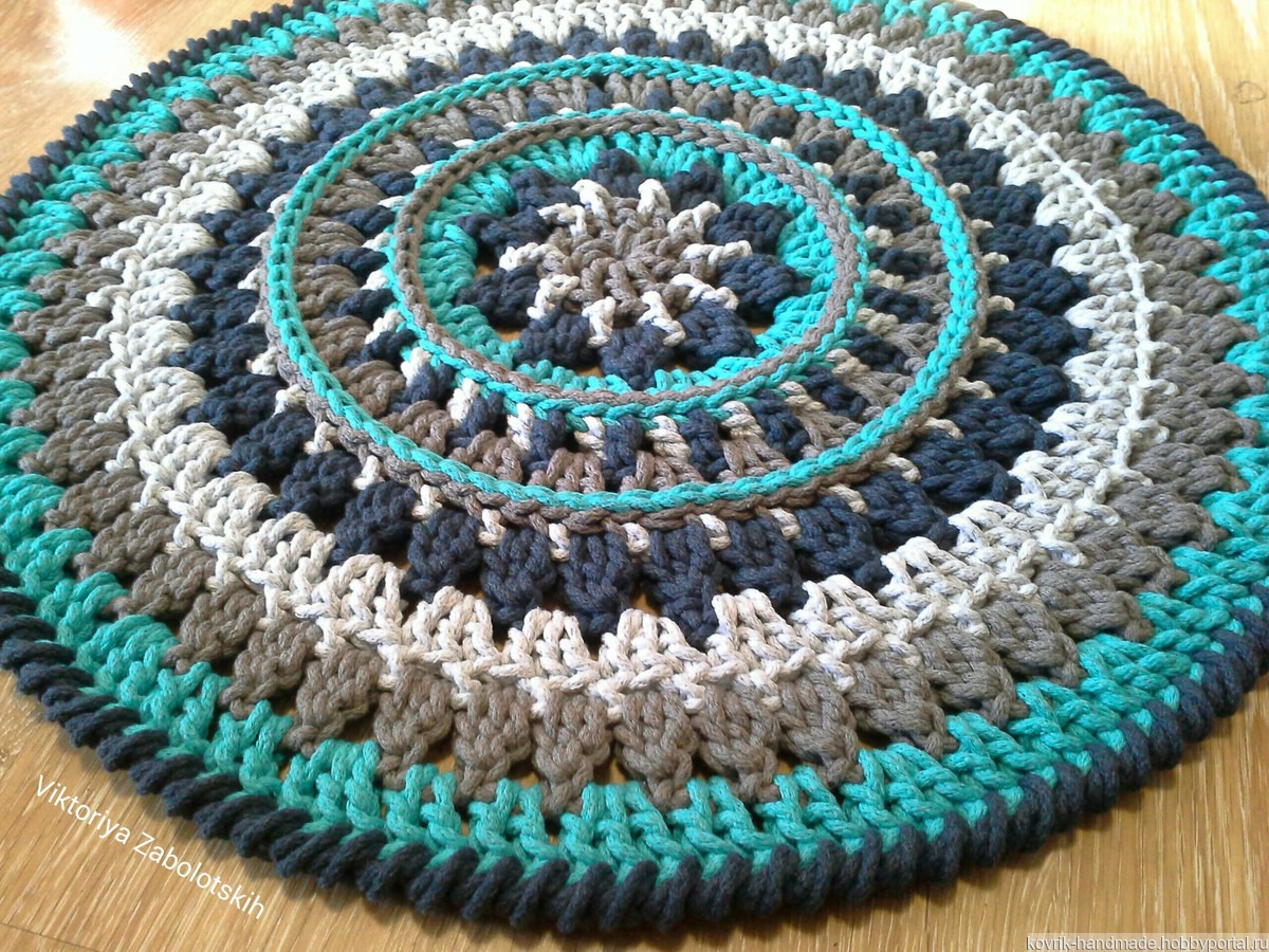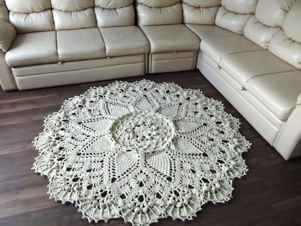 وحتى المبتدئ يمكنه تحمل مثل هذا النموذج: لا يوجد عمل مفتوح ، فقط أبسط العناصر. يتم تحديد حجم السجادة بناءً على التفضيل الشخصي. إذا قمت بربطها من سلك بألوان مختلفة ، فستحصل على عنصر داخلي أنيق للغاية.
