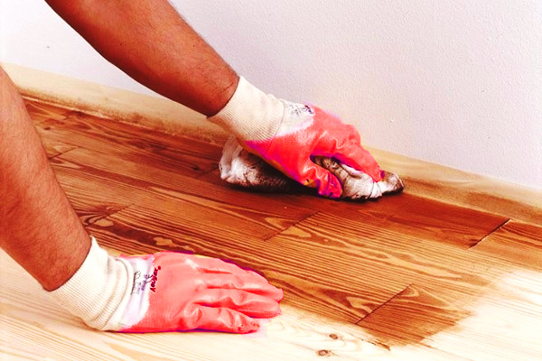 حتى يتم امتصاص المنتج جيدًا في الخشب ، من الضروري إعداد مكان مستعاد. للقيام بذلك ، قم بإزالة الغبار. أزل الغطاء من السطح المصقول أو المصقول باستخدام مذيب.
