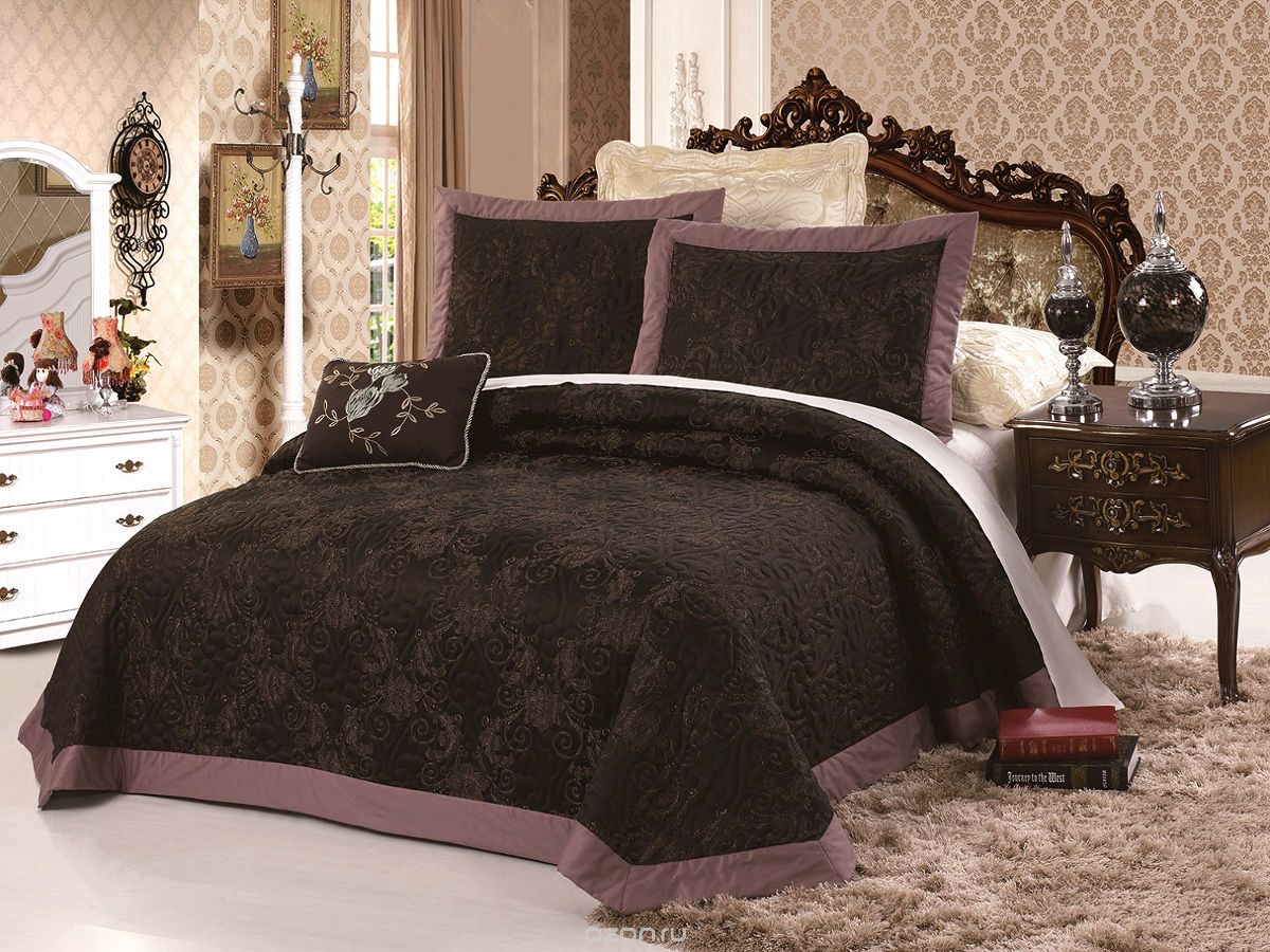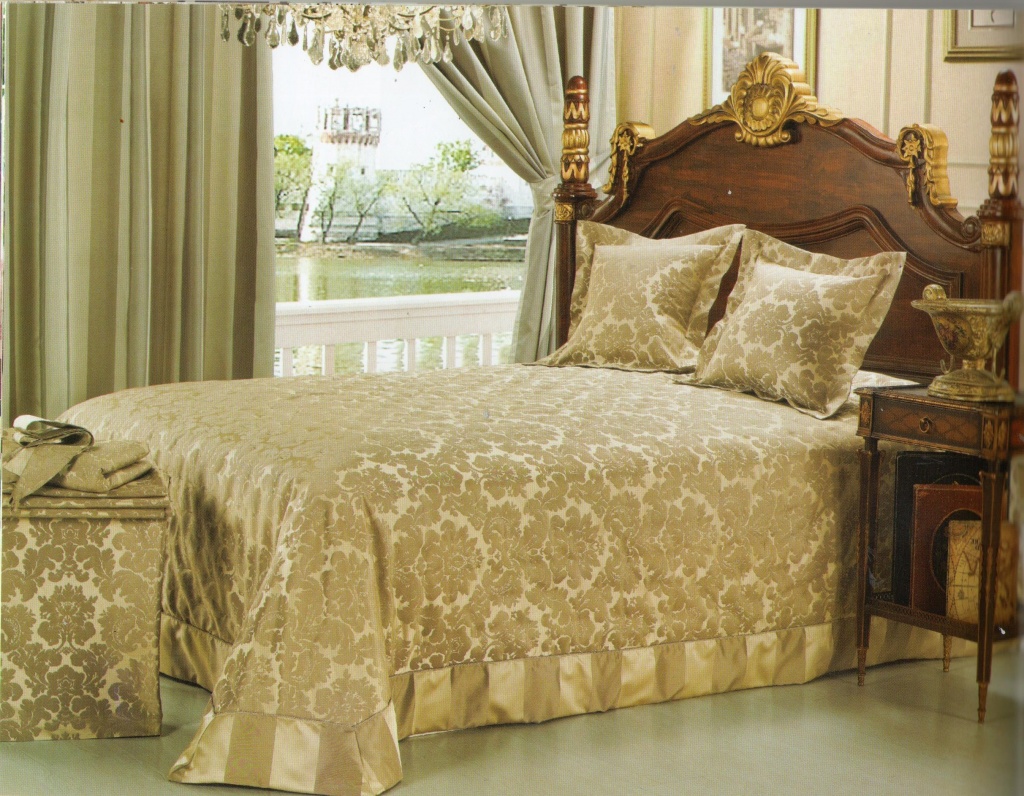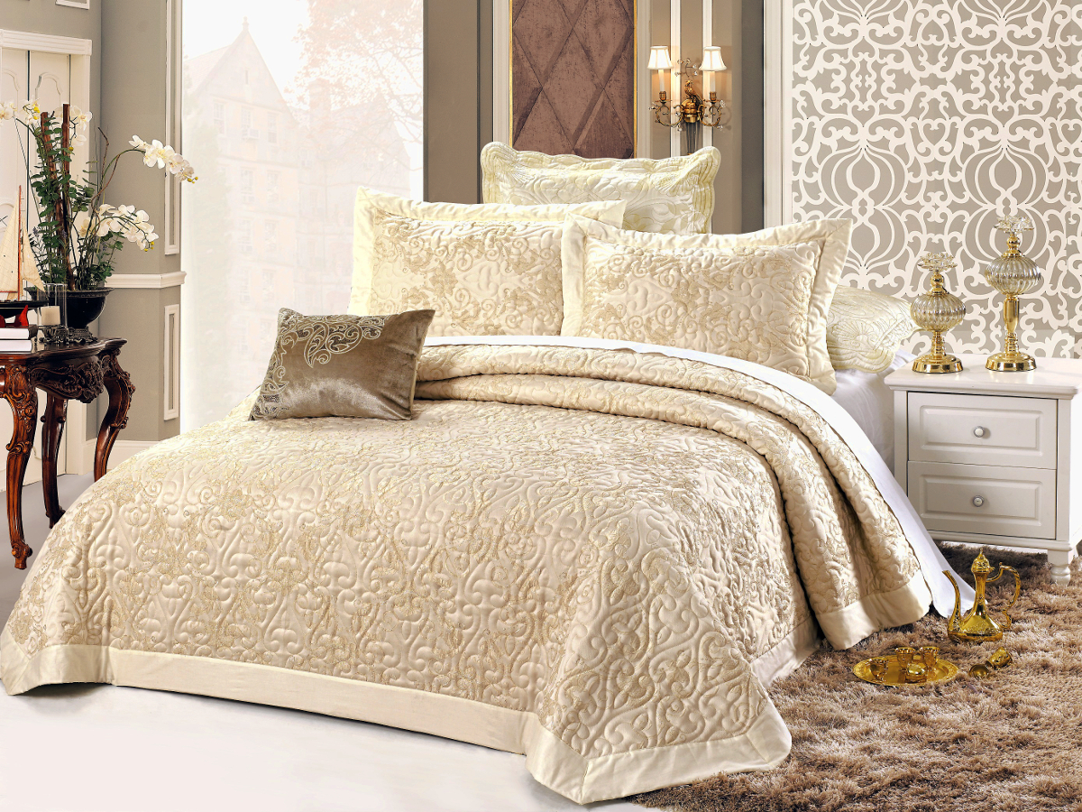 - الباروك ، آرت ديكو وغيرها من الأساليب أبهى تملي ظروفهم. هنا غطاء غرفة النوم يكمل الداخلية الفاخرة. فقط الأقمشة الغنية ، والأنسجة الثقيلة ، وفرة من التطريز الذهب والديكور مقبولة. لنفترض النسيج اللون المشبع مع لمعان.