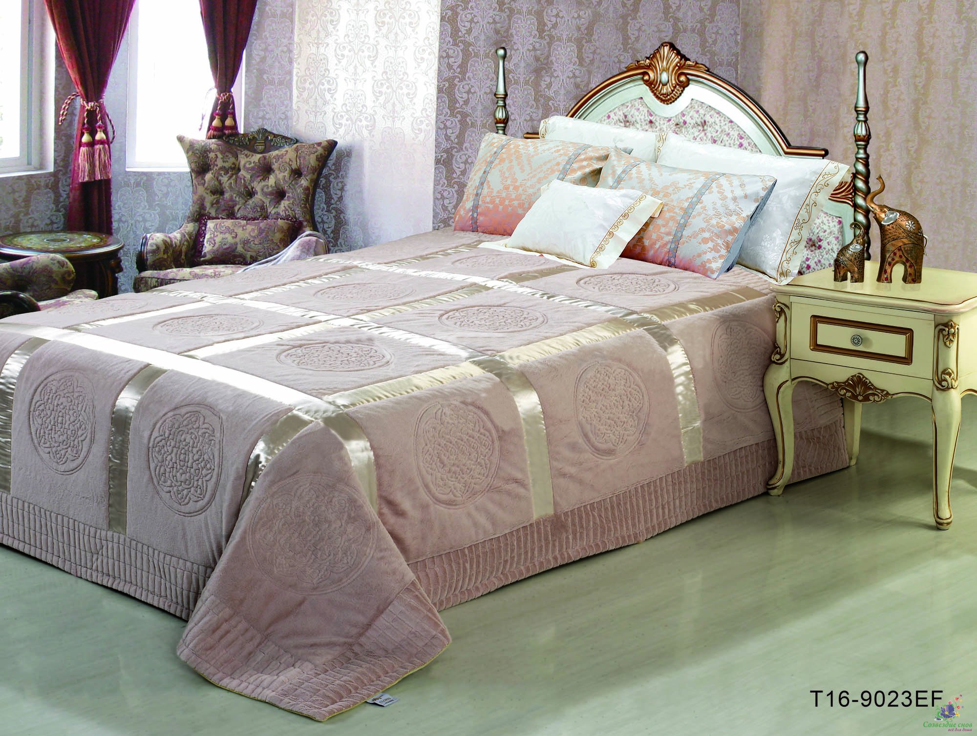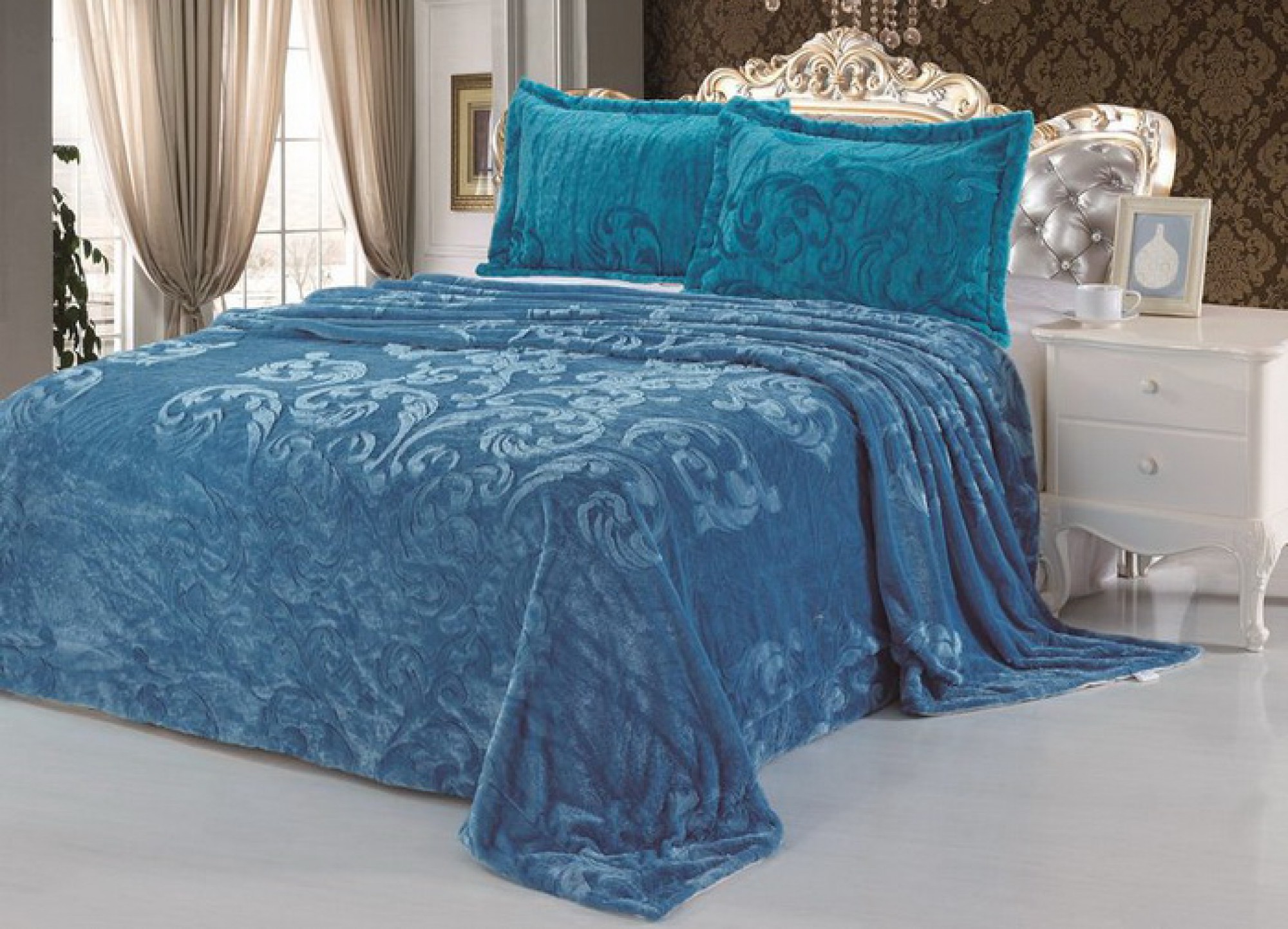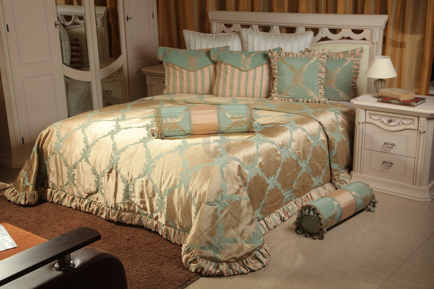 - الباروك ، آرت ديكو وغيرها من الأساليب أبهى تملي ظروفهم. هنا غطاء غرفة النوم يكمل الداخلية الفاخرة. فقط الأقمشة الغنية ، والأنسجة الثقيلة ، وفرة من التطريز الذهب والديكور مقبولة. لنفترض النسيج اللون المشبع مع لمعان.