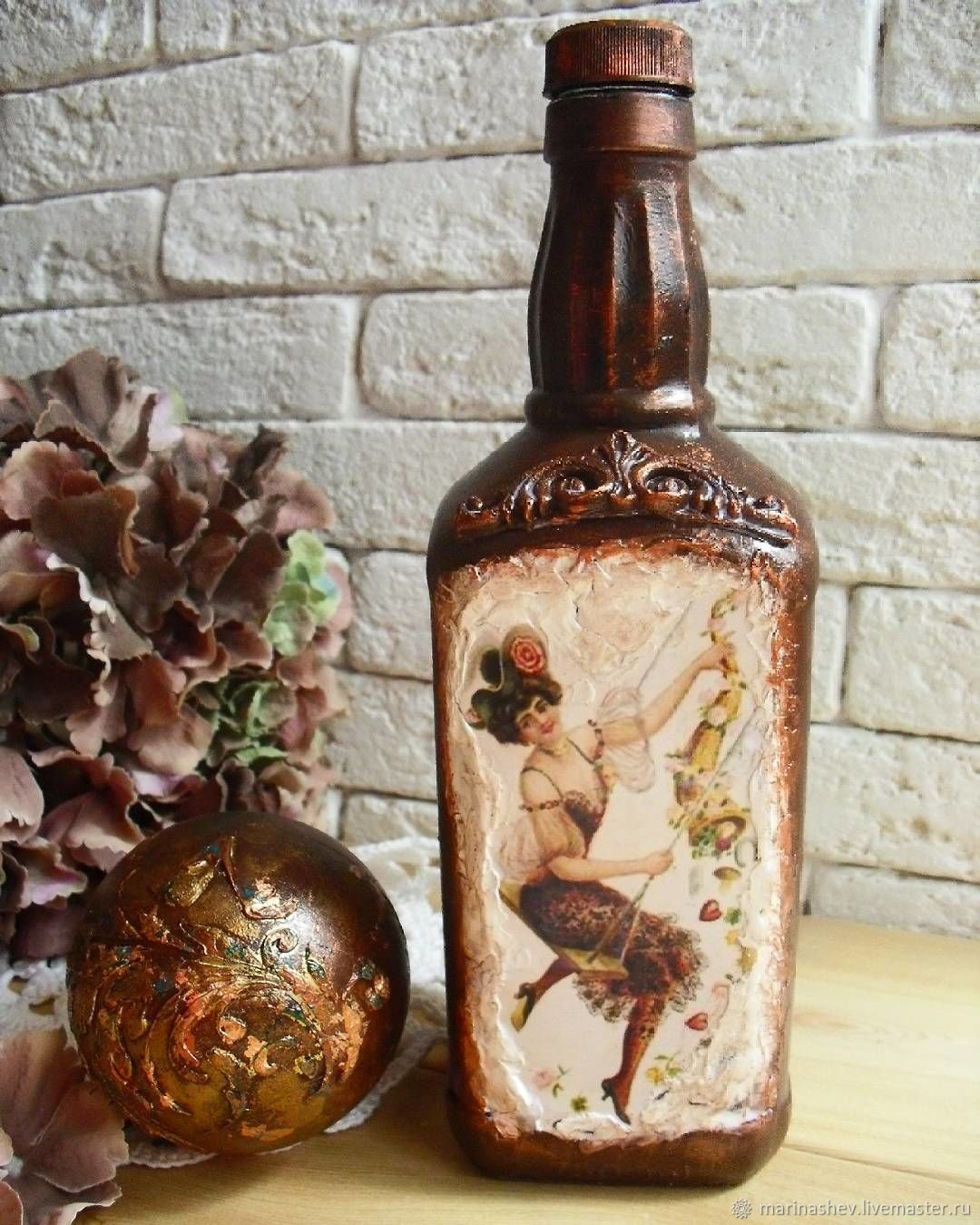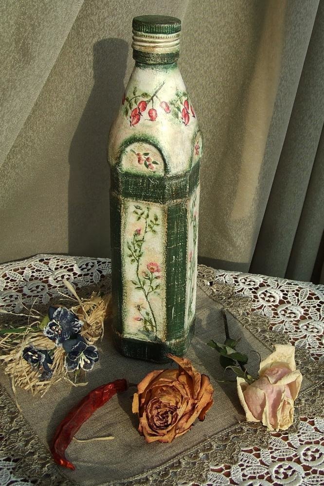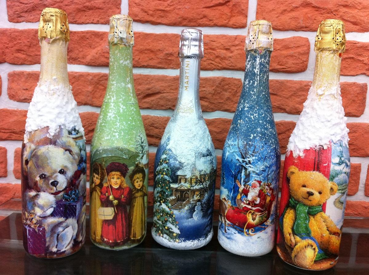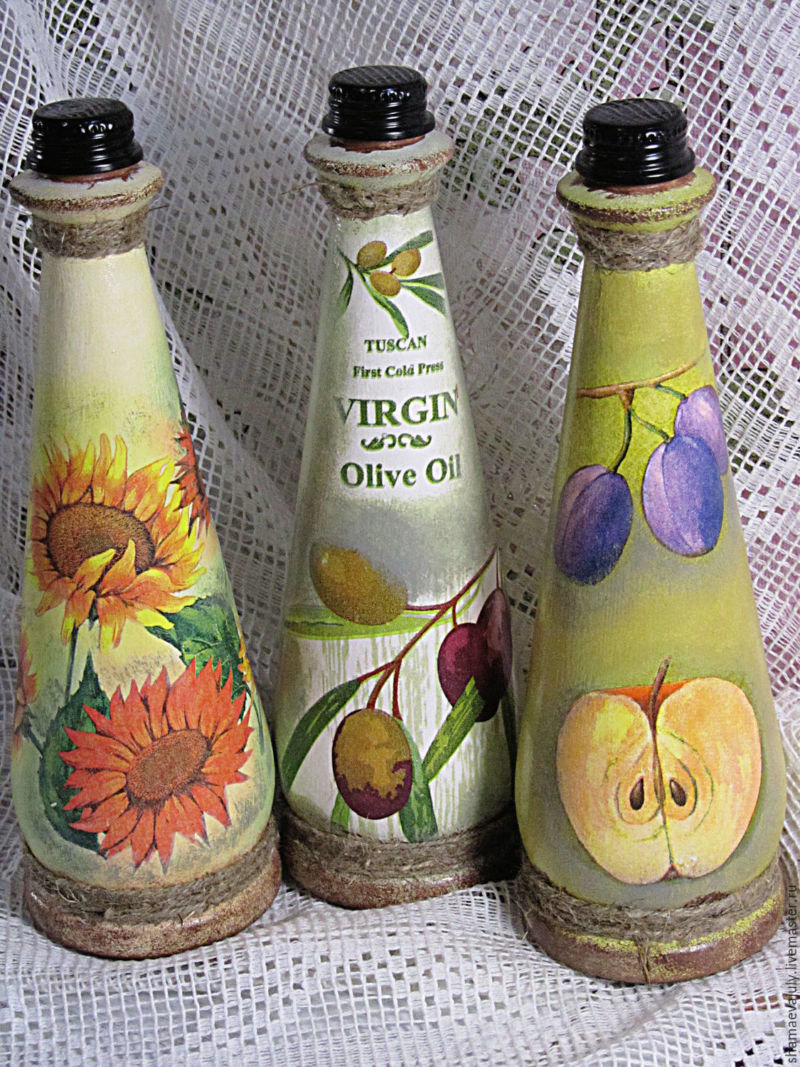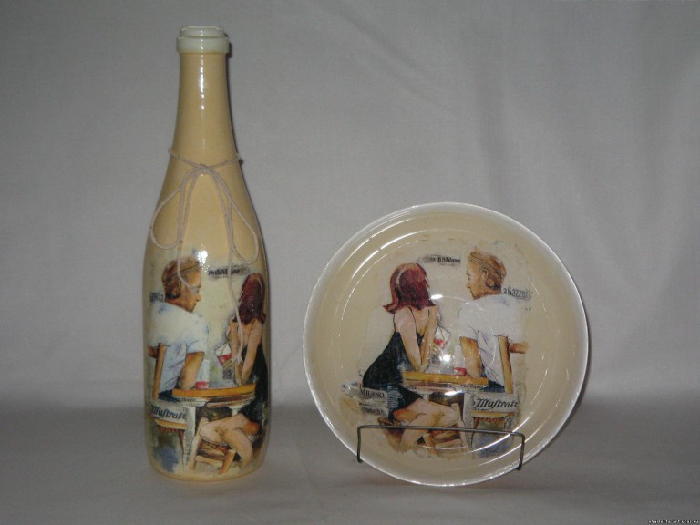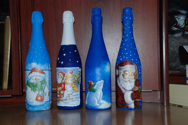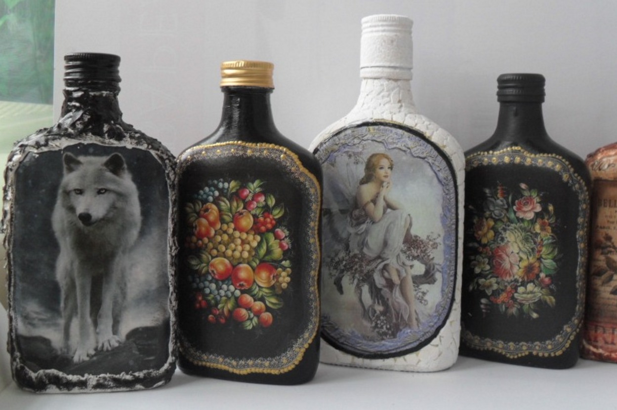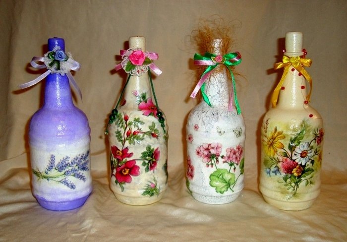 للتجربة الأولى ، يمكنك استخدام الفارغة الفارغة ، وأداء decoupage على زجاجات من الزجاج أو البلاستيك.