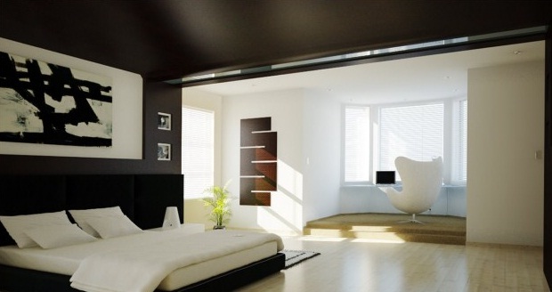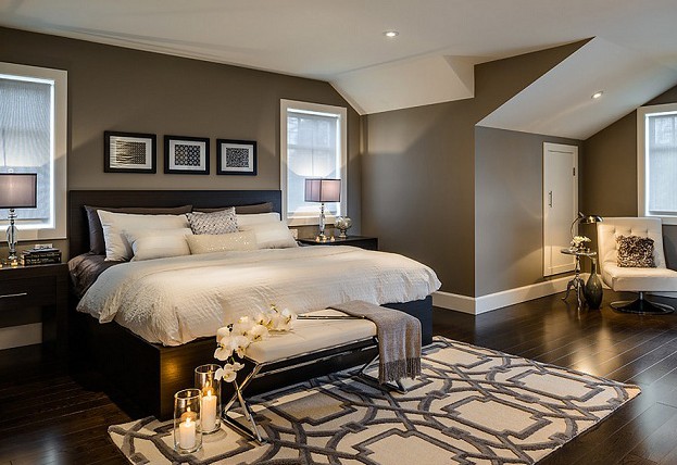 - الأرضية الداكنة المصنوعة من الخشب الطبيعي (الباركيه أو السبورة) أو الرقائق في غرفة ذات جدران بيضاء وسقف ستجعل الغرفة أكبر بصريًا.