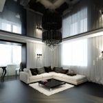 أثاث أبيض في الغرفة مع أرضيات وجدران داكنة ، يبدو السقف الفاتح أنيقًا ونبيلًا.