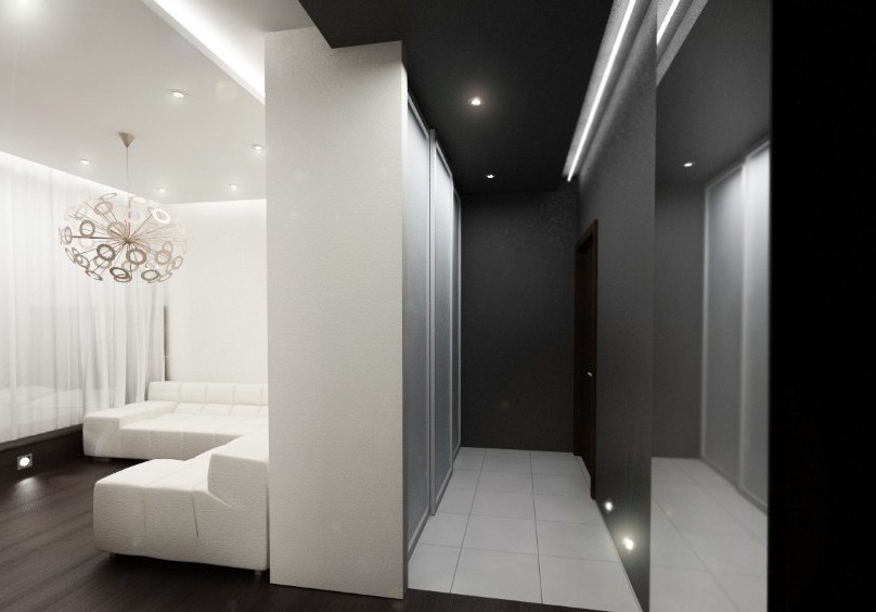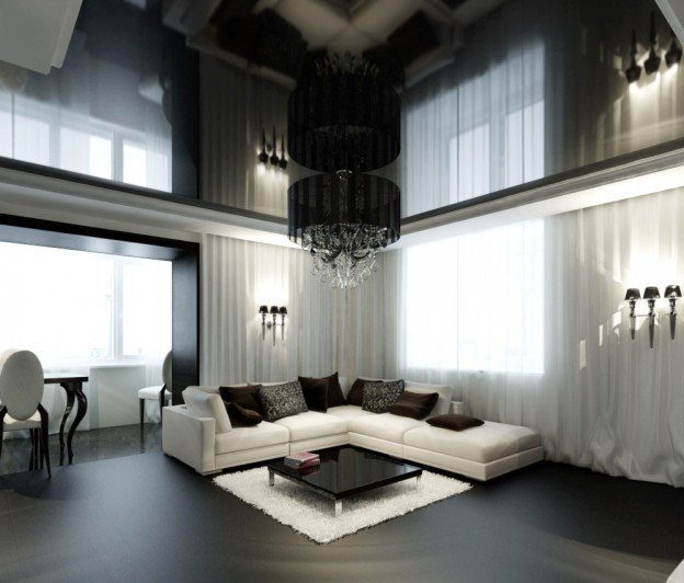 أثاث أبيض في الغرفة مع أرضيات وجدران داكنة ، يبدو السقف الفاتح أنيقًا ونبيلًا. اللون الأسود للأرض هو اتجاه عصري في تصميم الألوان الحديث. هنا يجب أن نحاول اختيار لون الأثاث حتى لا نكون في غرفة مظلمة محبطة. سوف أسود كثيف تمييع بيضاء جديدة. الغرض من الغرفة يملي اختيار اللون. مجموعة الألوان هذه جيدة للمكتب المنزلي ، غرفة معيشة صغيرة. رواق مظلم مع أثاث أبيض وباب يبدو غير عادي وجريء. أرضية الحمام الأسود تتطلب مساحة وجدران بيضاء وسقف.