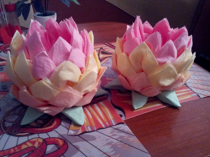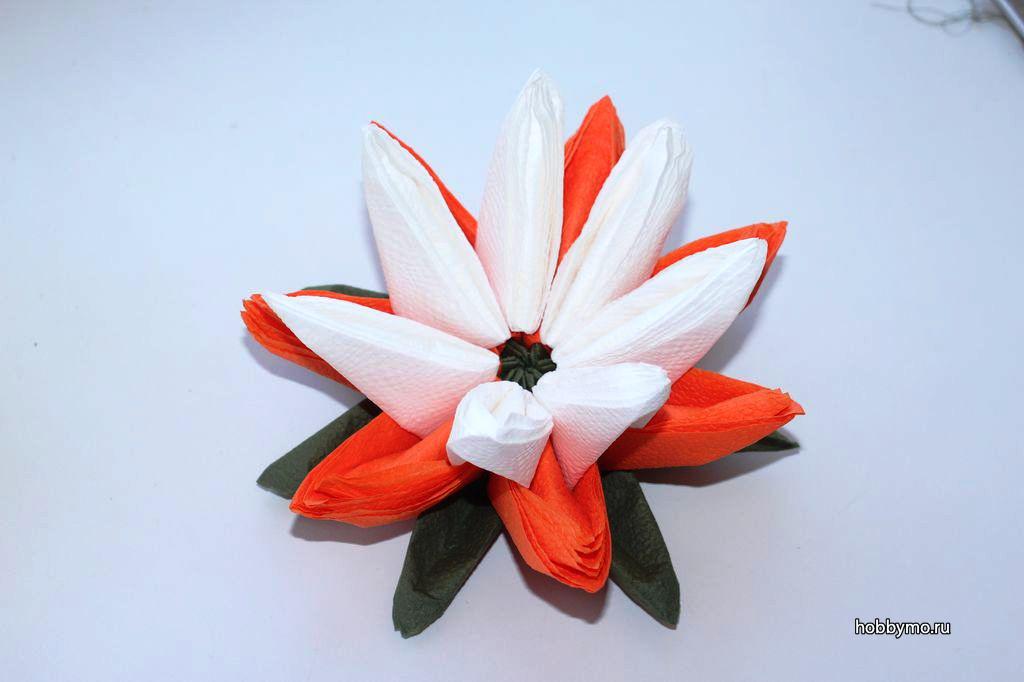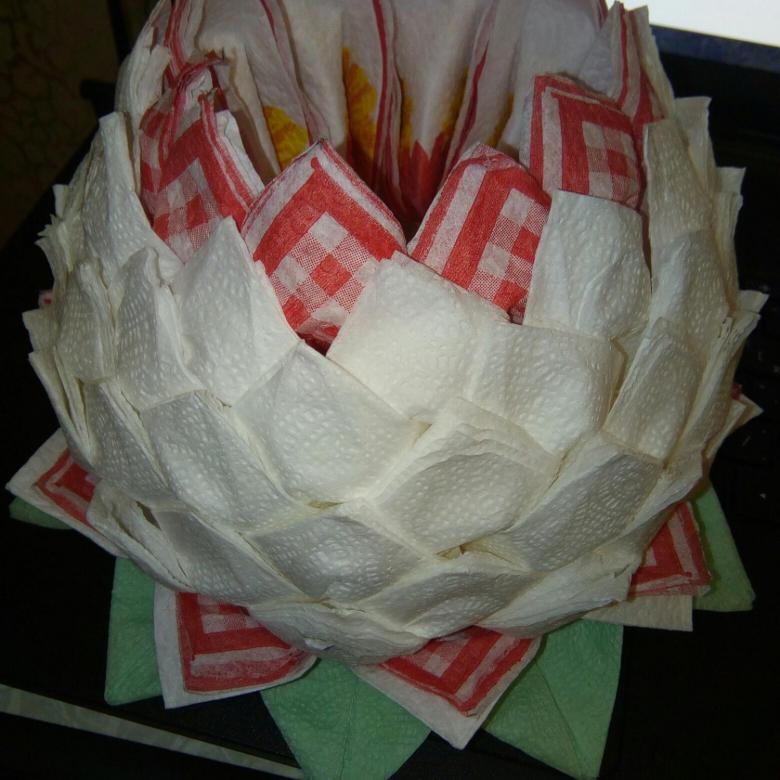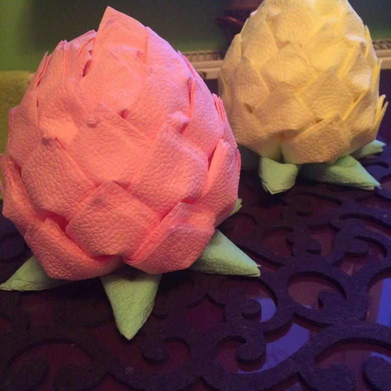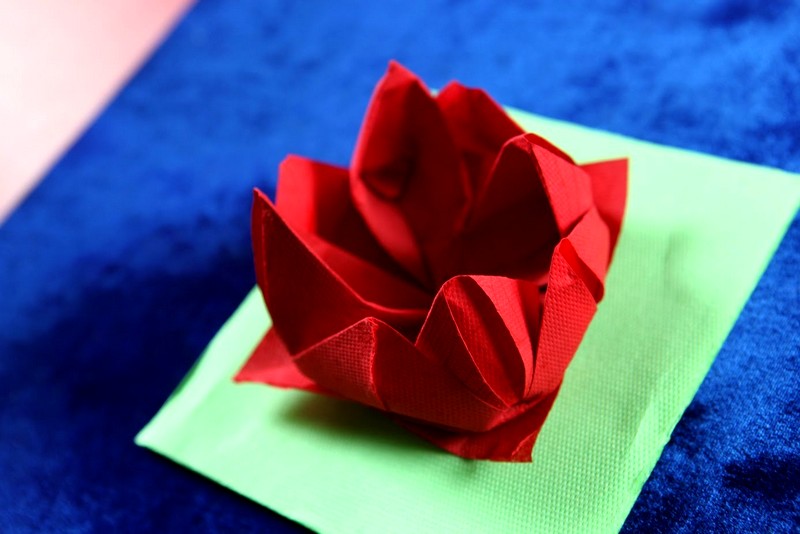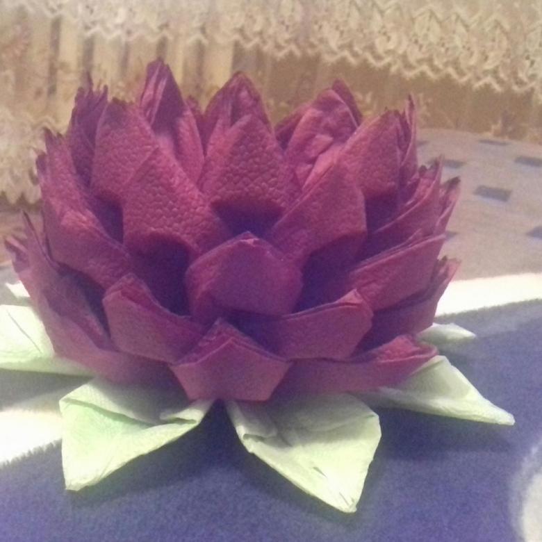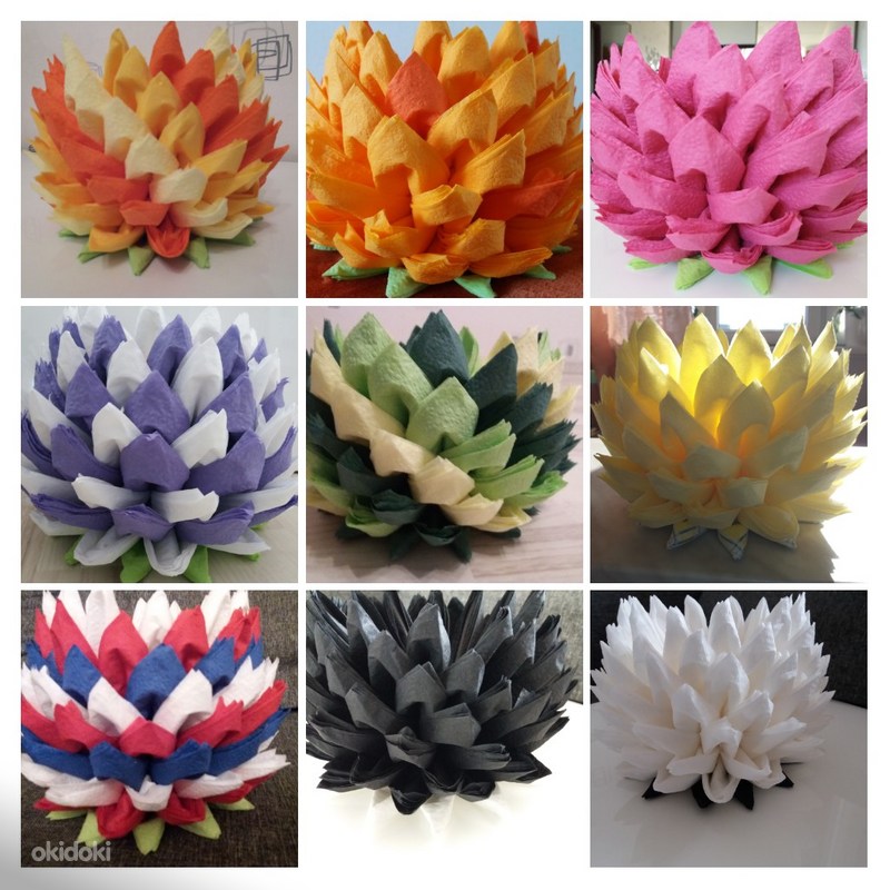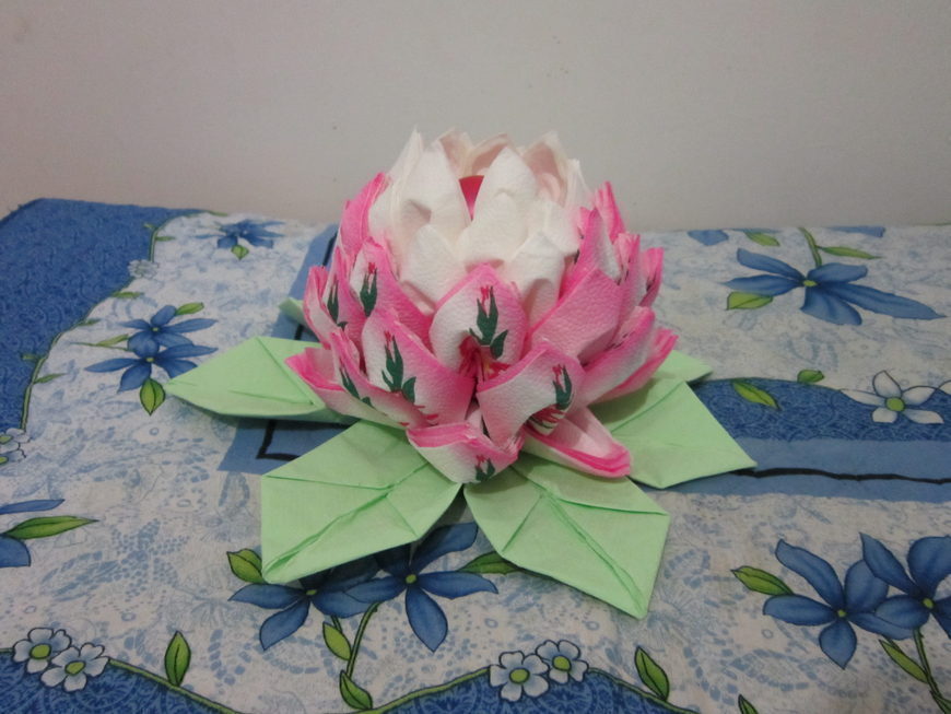 الزهرة المصنوعة من المناديل واللوتس على الطاولة هي عنصر أنيق وجذاب في الديكور. ليس من قبيل المصادفة أن يرغب العديد من الحرفيات في المنزل في تعلم كيفية صنع الكثير من المناديل.