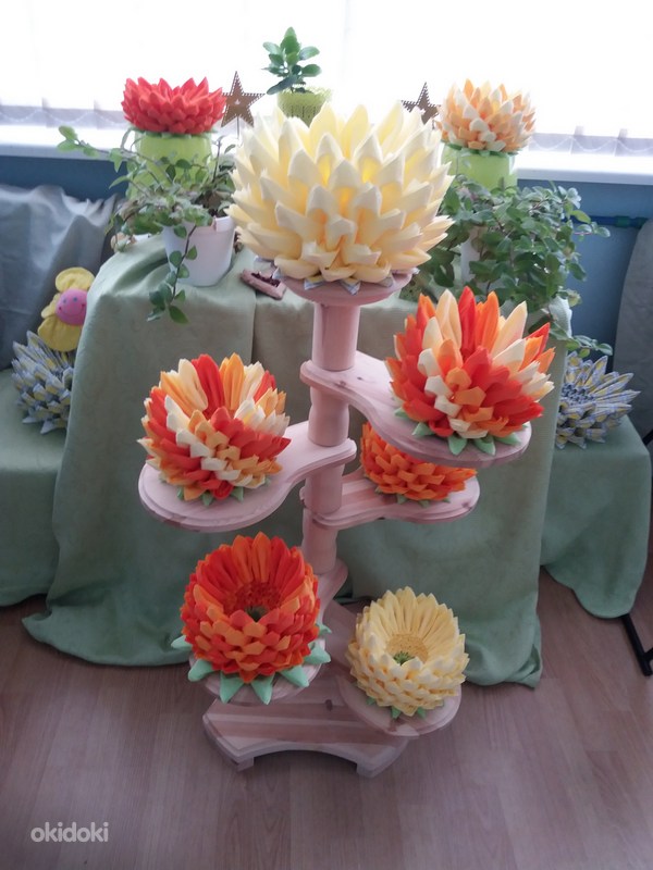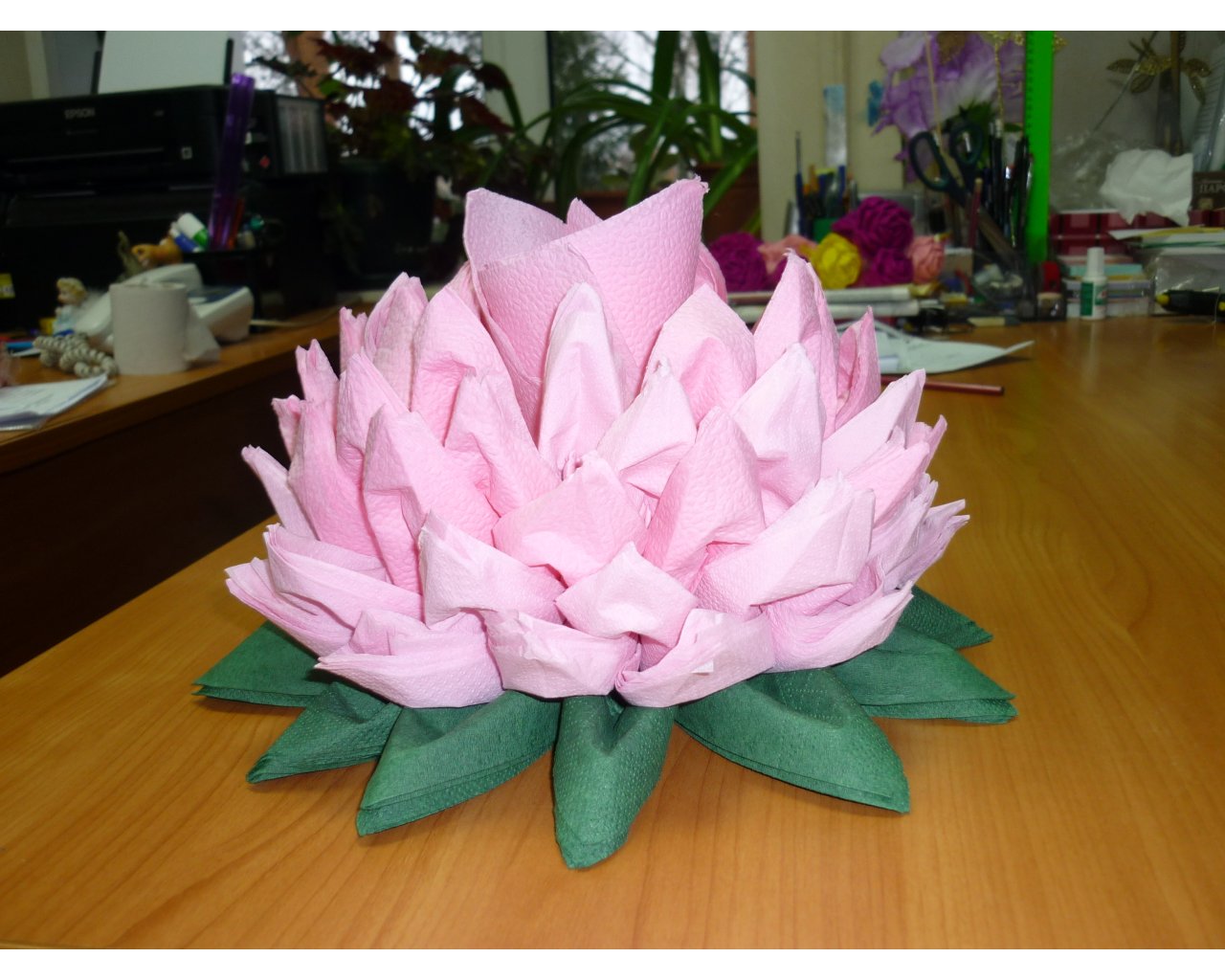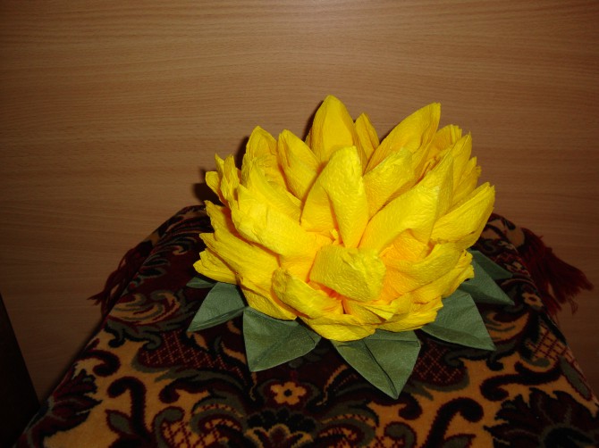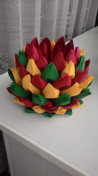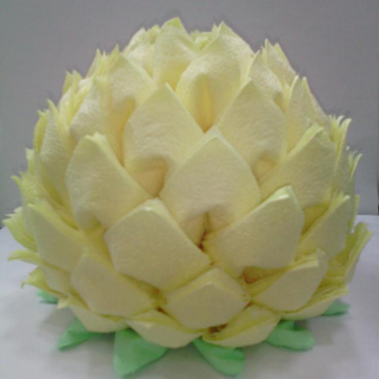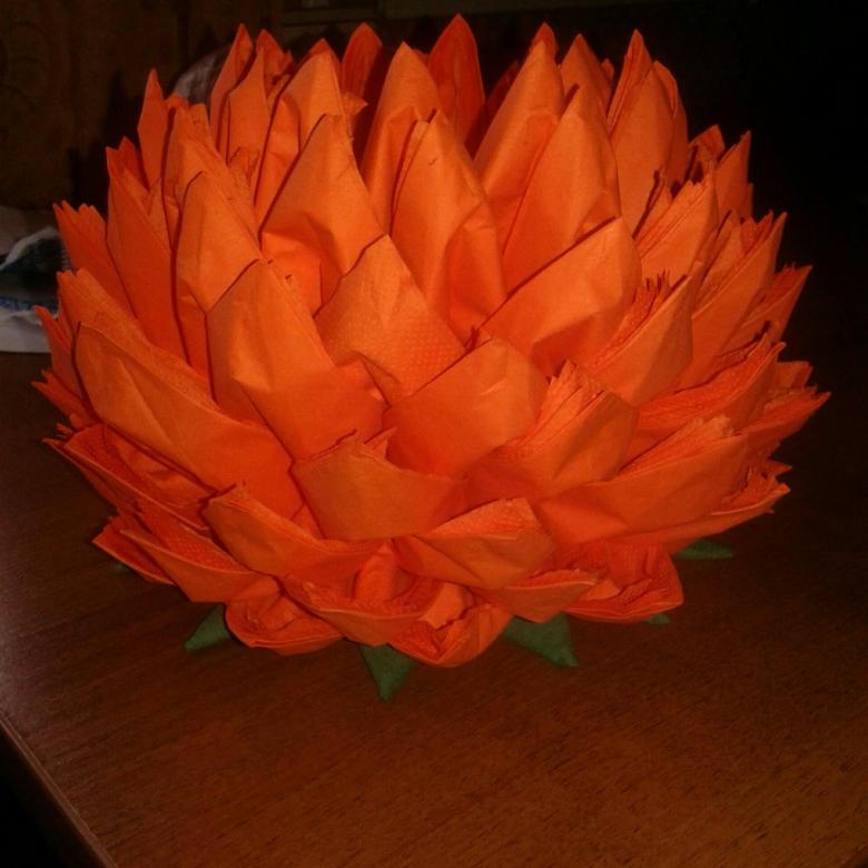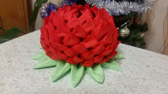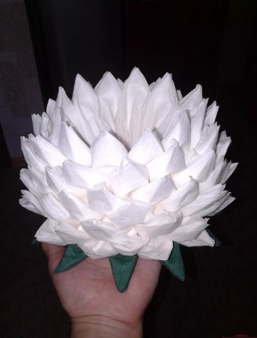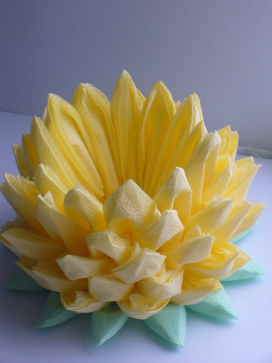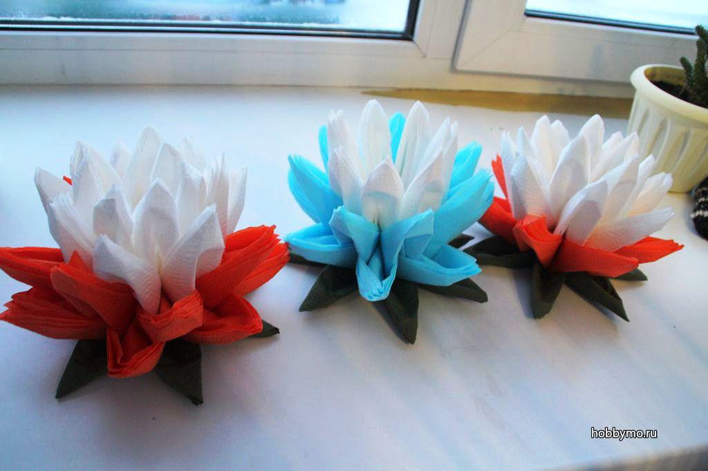 الزهرة المصنوعة من المناديل واللوتس على الطاولة هي عنصر أنيق وجذاب في الديكور. ليس من قبيل المصادفة أن يرغب العديد من الحرفيات في المنزل في تعلم كيفية صنع الكثير من المناديل.