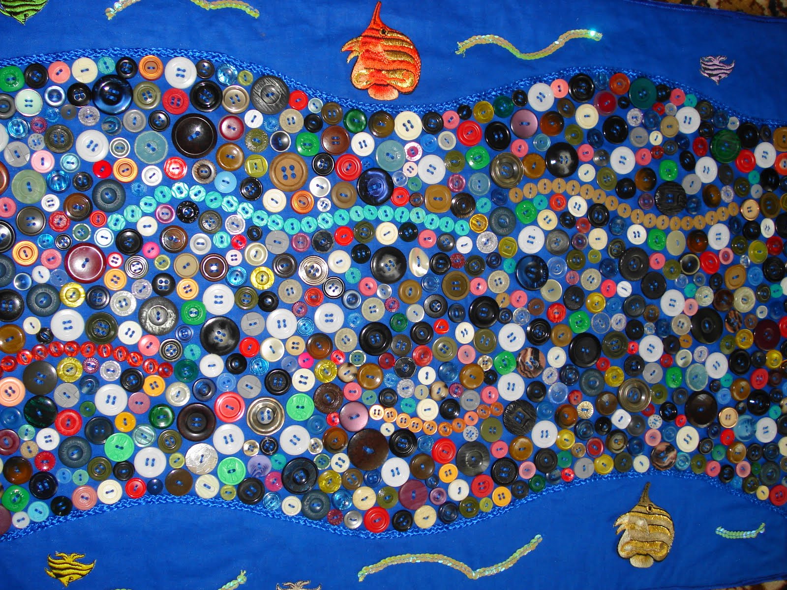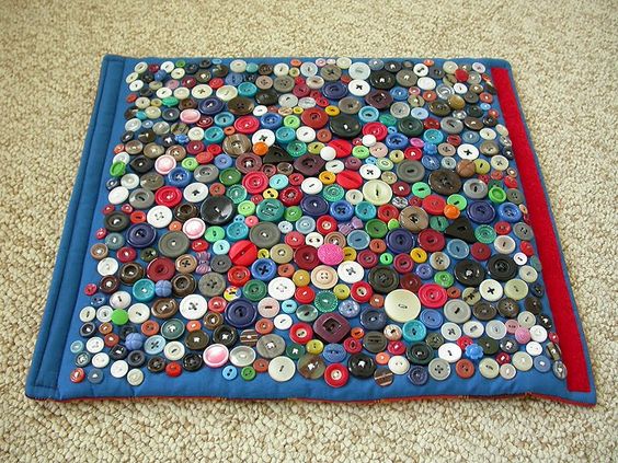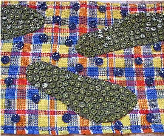 يتم خياطة الأزرار في ترتيب عشوائي ، بالتناوب الكبيرة والصغيرة ، على النسيج مع خيوط دائمة. ثم القماش مع أزرار التواصل مع أساس كثيف. الانتهاء بالفعل تقليم قماش.