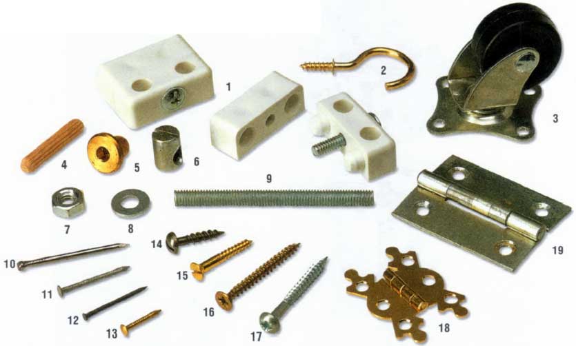 - آليات التركيب. يتم استخدامها لإصلاح وتوصيل الأجزاء مع بعضها البعض ، وتشمل هذه المكسرات ، البراغي ، الأظافر ، البراغي ، البراغي ، إلخ.