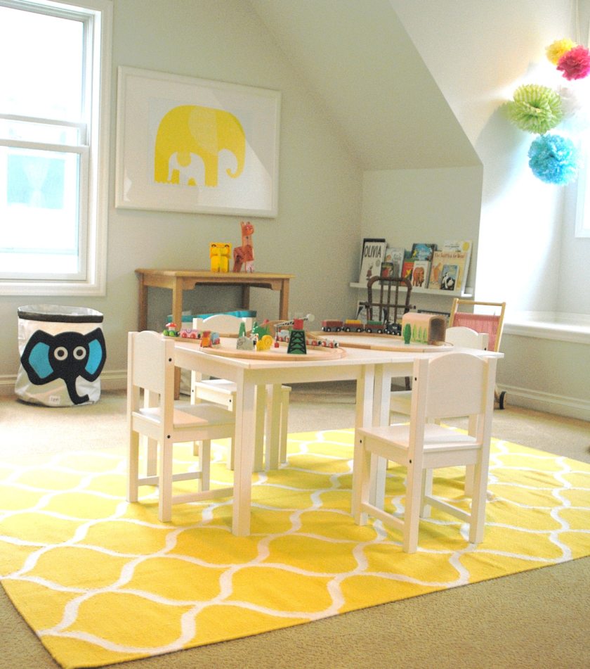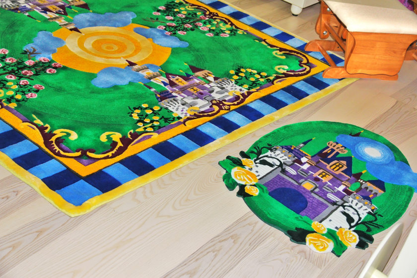 يغطي السجاد الكبير الأرضية بالكامل تقريبًا ، مما يضمن عزلًا حراريًا جيدًا وسلامة الطفل أثناء الألعاب. ومع ذلك ، وضعت هذه الطرز بطريقة لا يقف عليها الأثاث ، لأن السجاد غالباً ما يجب أخذه وتنظيفه.