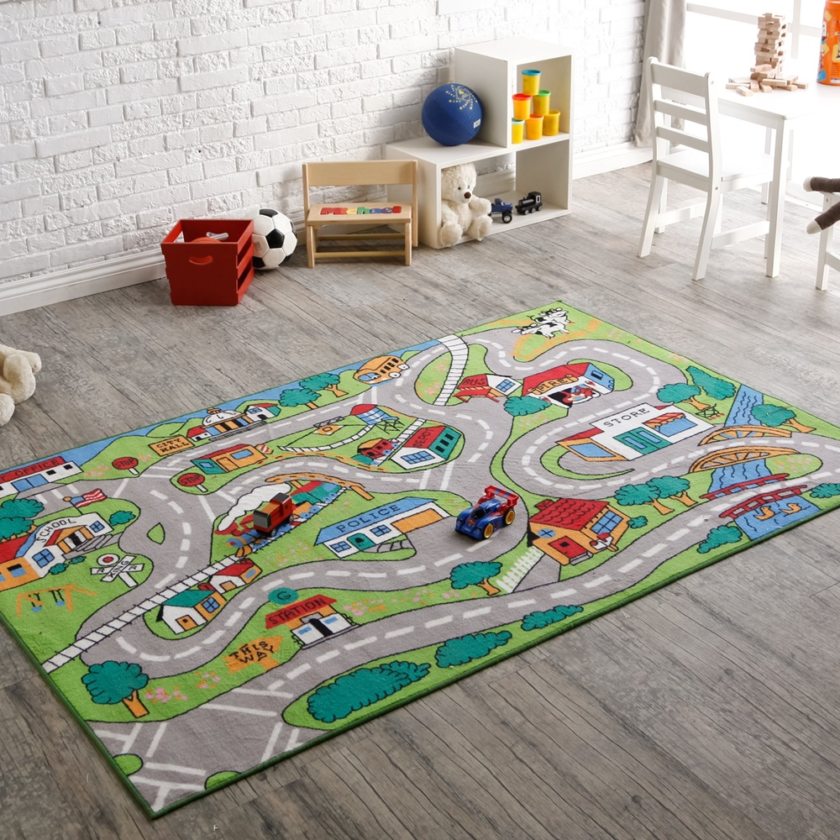 سيكون خيارًا جيدًا في الحضانة قصرًا بتقليد الملعب. يمكن أن يكون سجادة مع صورة لطريق سريع أو سكة حديد أو جزيرة أو مدينة أو متاهة رائعة.