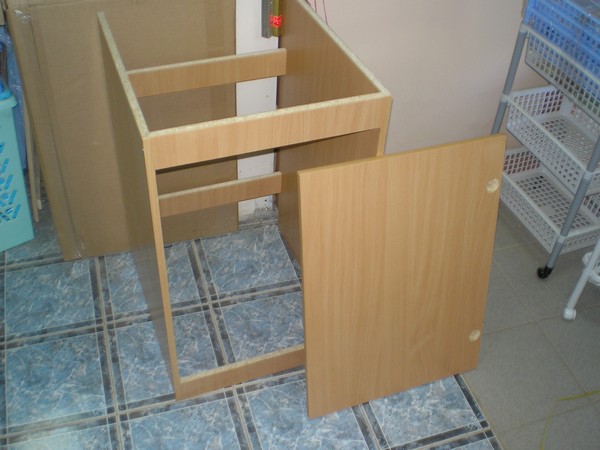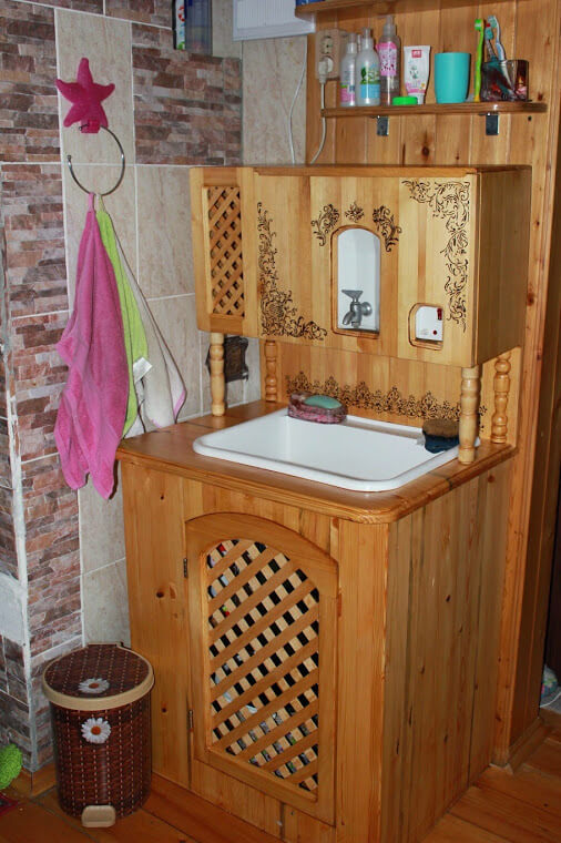 - تم تركيب الخزانة النهائية في الحمام في مكانها ، إذا لزم الأمر ، ثابتة. في النهاية ، يمكن تزيين المنتج باستخدام فيلم لاصق ذاتي ، ومينا ، وورنيش ، وقشرة.