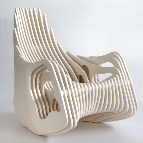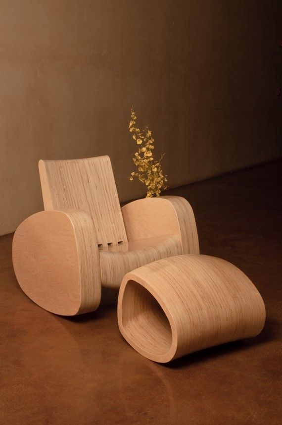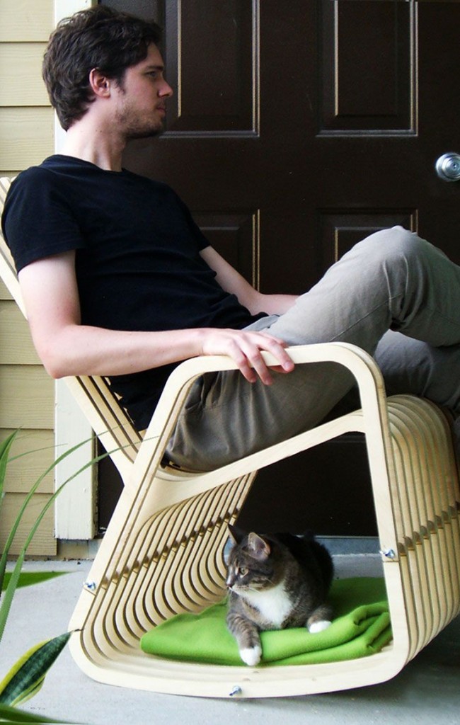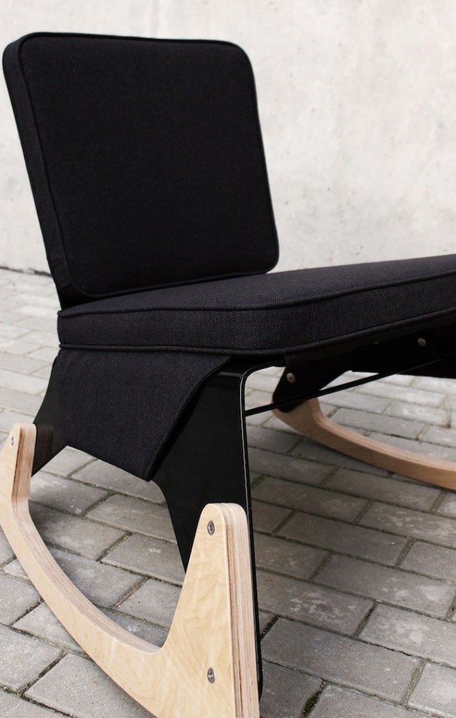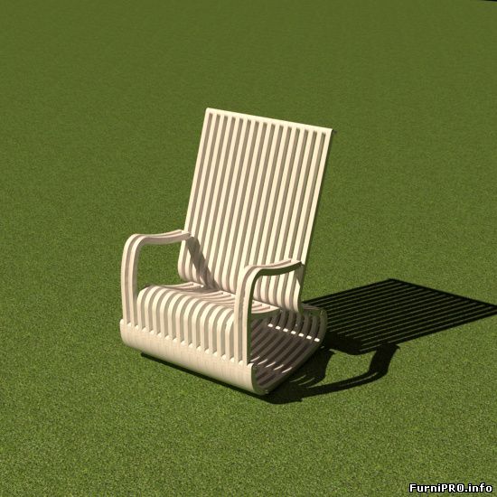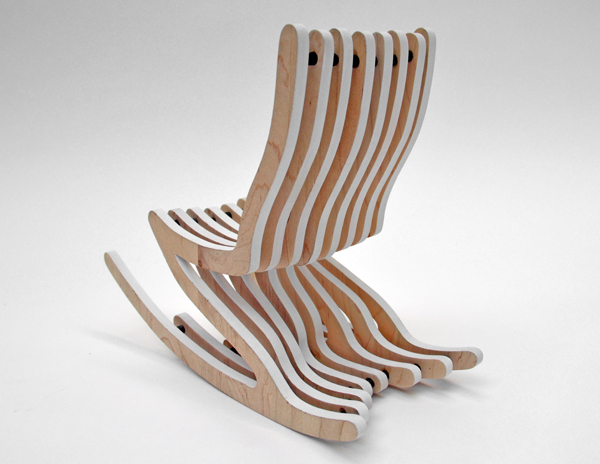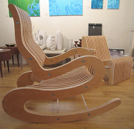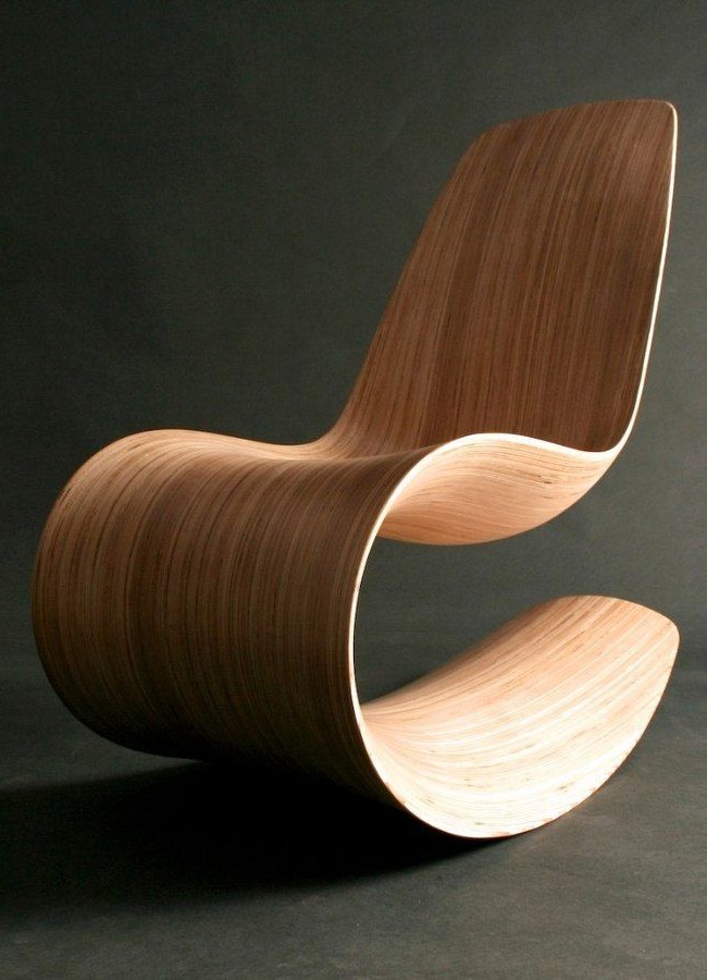 النظر في نسخة بسيطة أخرى من الكرسي الهزاز الأصلي مصنوعة من الخشب الرقائقي. يتكون الكرسي من وجهين على شكل ذراع الرافعة والأدلة المستعرضة من الجدار إلى الجدار بمبلغ 14 قطعة.