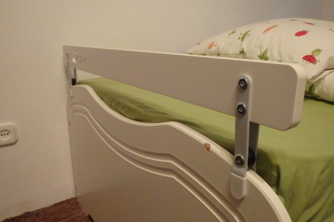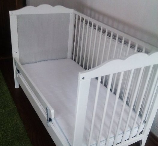 لكن لسوء الحظ ، لم يتم تجهيز جميع أسرّة الأطفال بجانب مع جهات تصنيع أخرى. لهذا السبب قرر خبراء Ikea إنشاء هيكل وقائي قابل للإزالة يناسب أي نموذج تقريبًا.