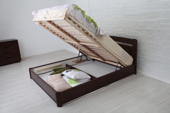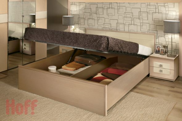 هناك خياران لإنشاء أماكن التخزين: الأدراج (لكنها تتطلب مساحة كبيرة حول السرير ، والتي غالباً ما تكون مشكلة ، بالنظر إلى حجم 1800x2000) وآلية الرفع.