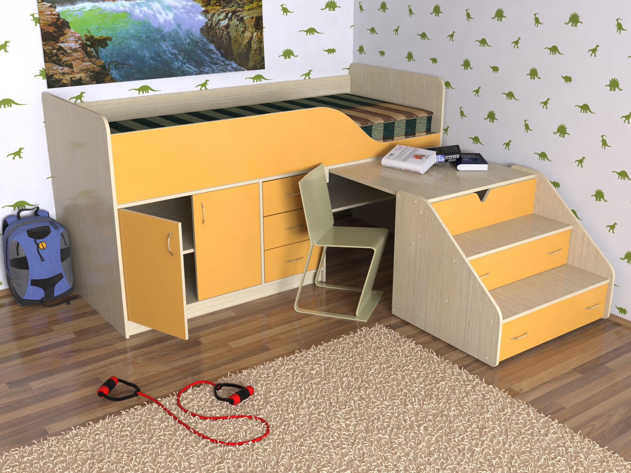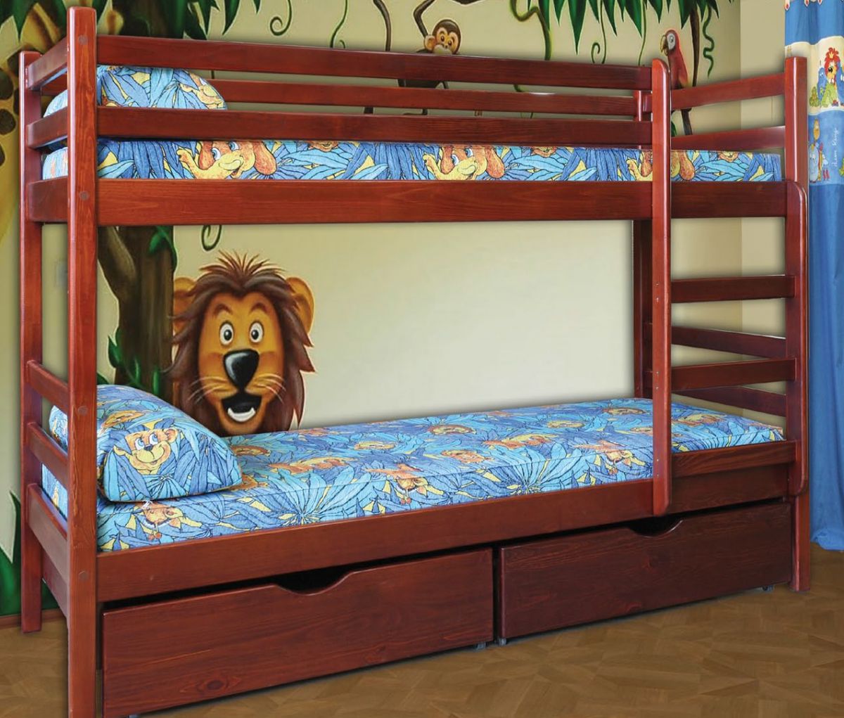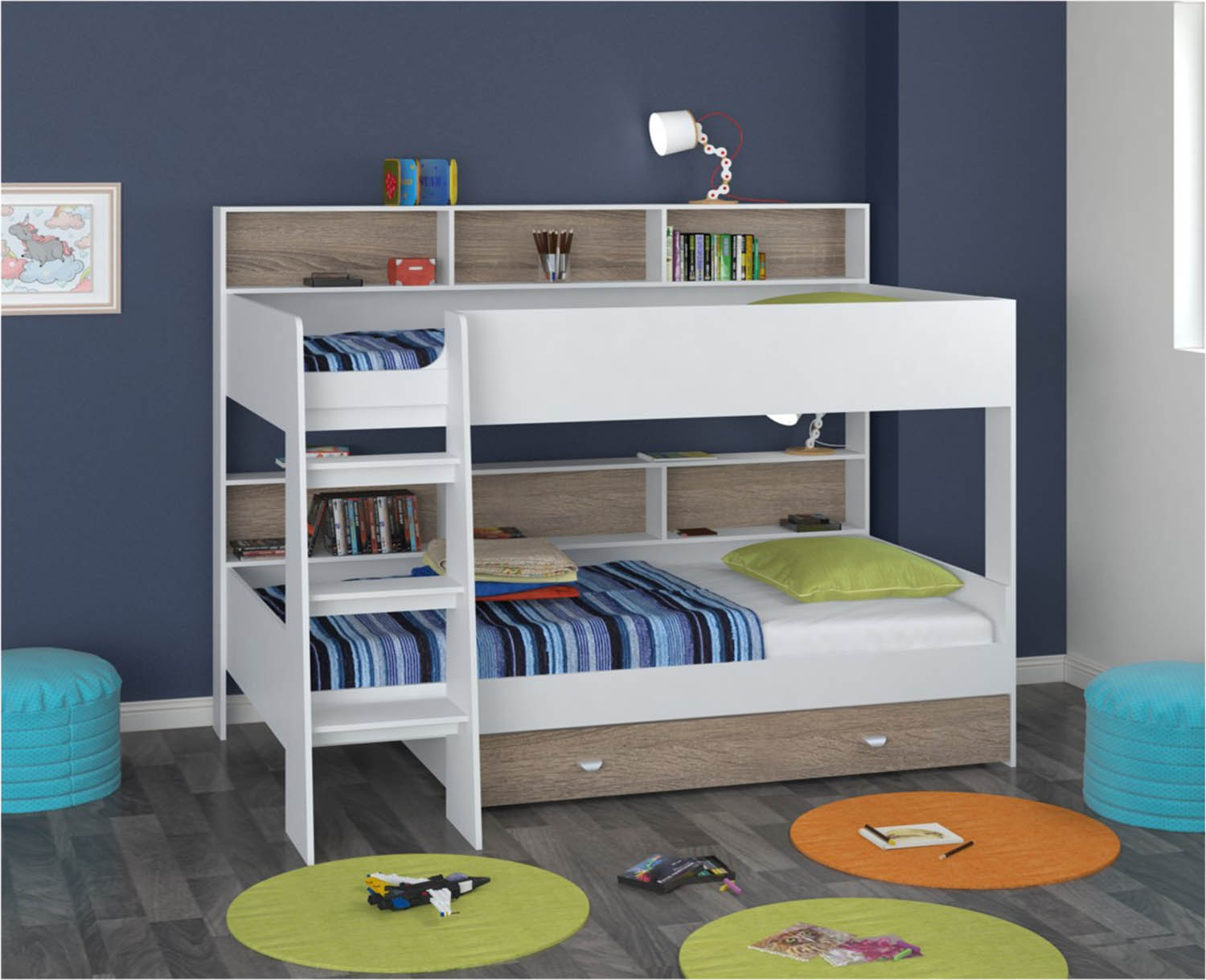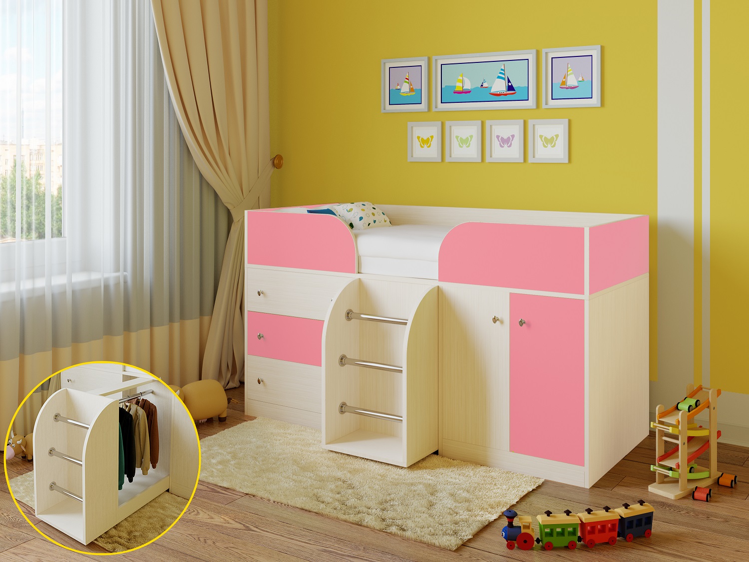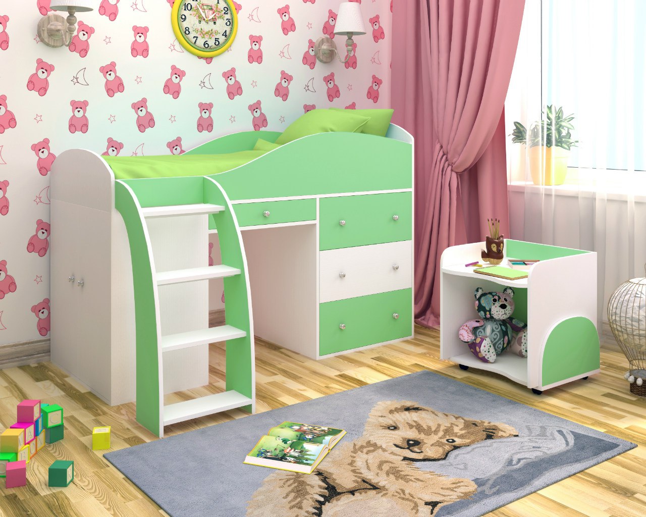 الأثاث بطابقين هو بديل رائع لسريرين في غرفة صغيرة. تتوفر أسرّة أطفال من عام واحد مع جوانب مع طاولة تغيير.