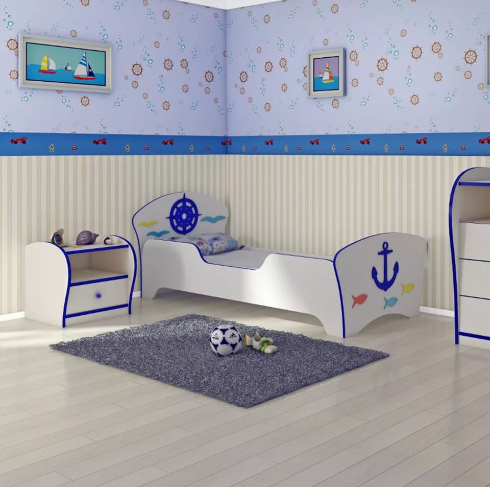 تصميم غير عادي للسرير مع مصدات على الطراز البحري.