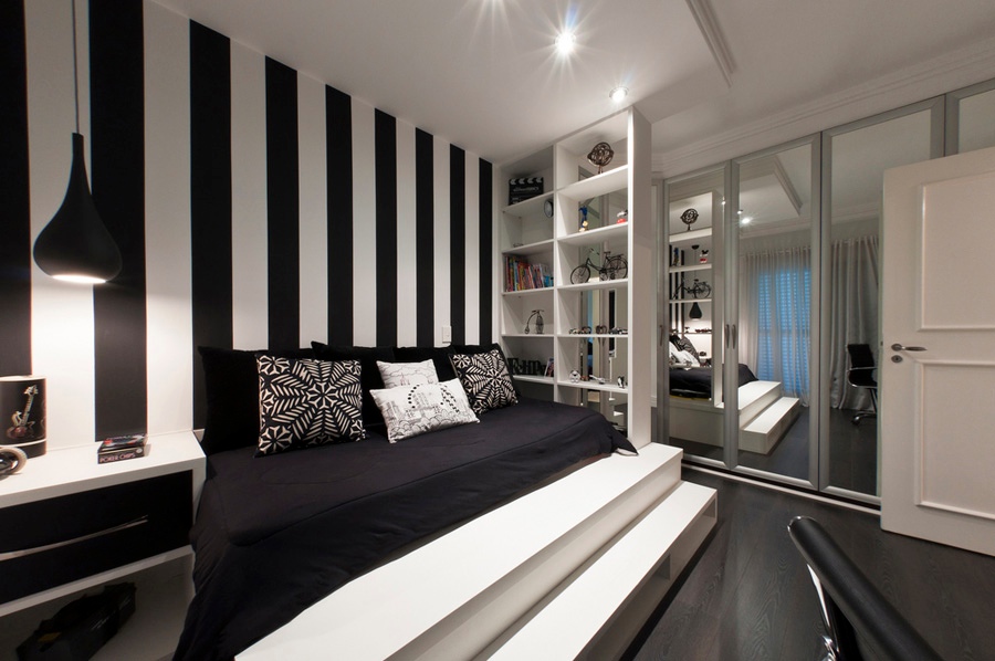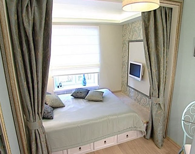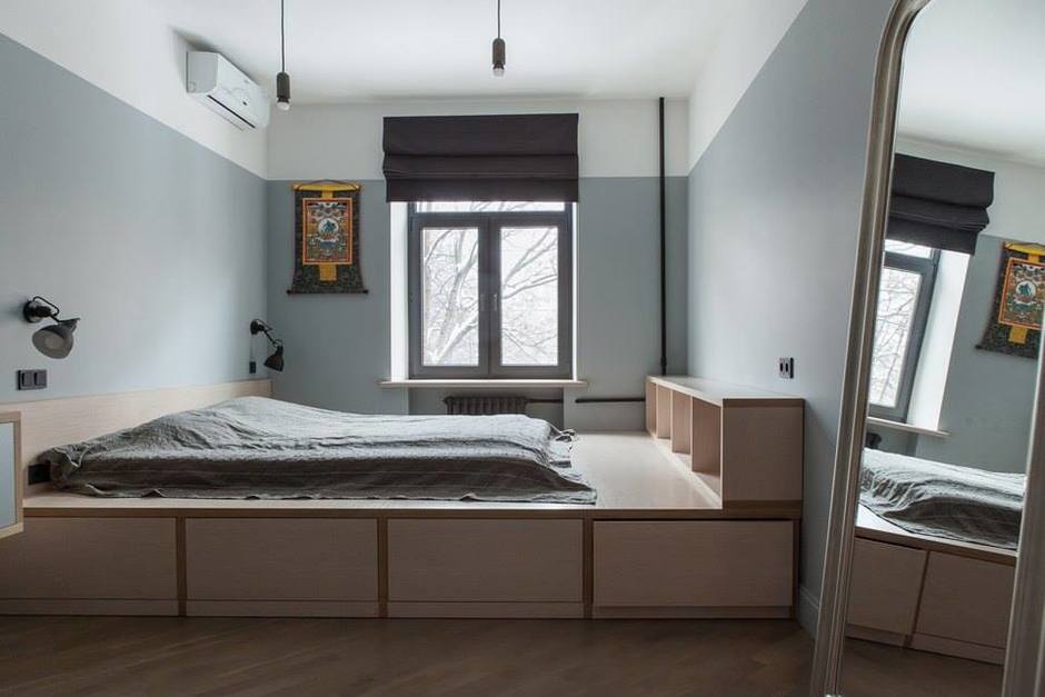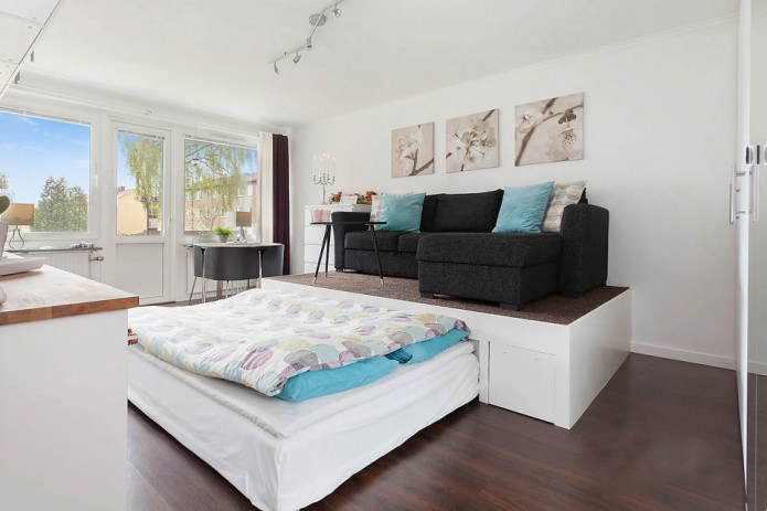 - تقسيم المناطق. باستخدام المنصة ، يمكنك اختيار أحد مناطق الغرفة. يتم تعريف مؤامرة سامية نفسيا كشيء منفصل عن بقية. بعد أن أصبحت مكانًا للنوم على المنصة ، وفصلتها مع الستائر ، يمكنك بسهولة الحصول على غرفة نوم منفصلة في شقة من غرفة واحدة.