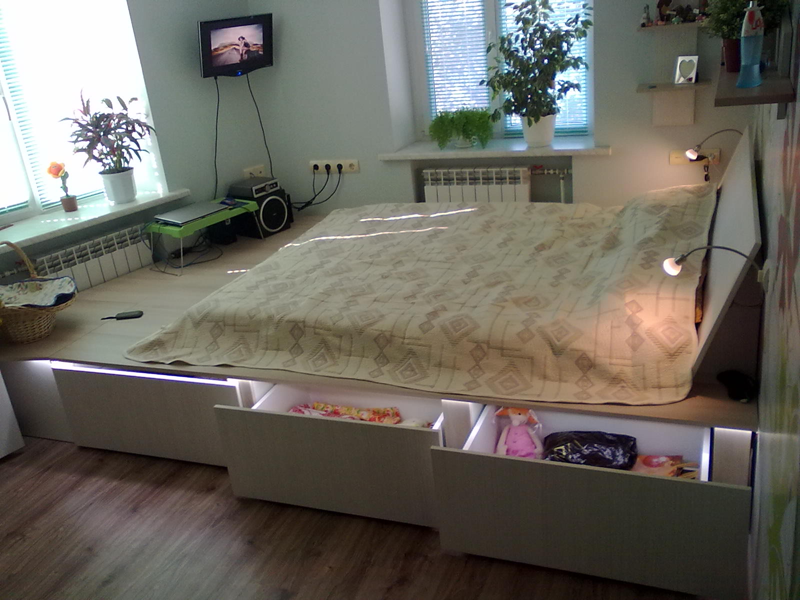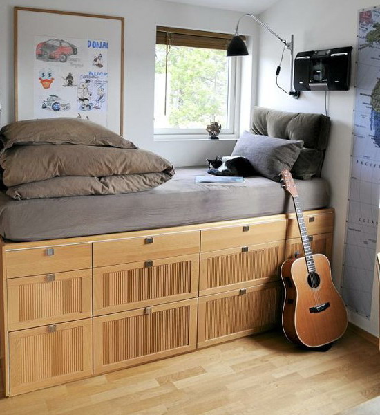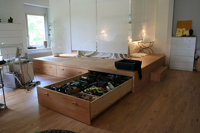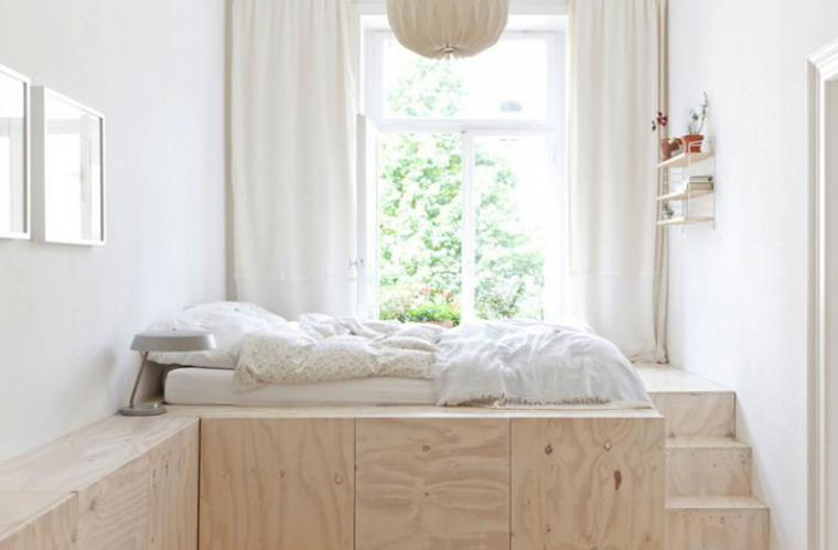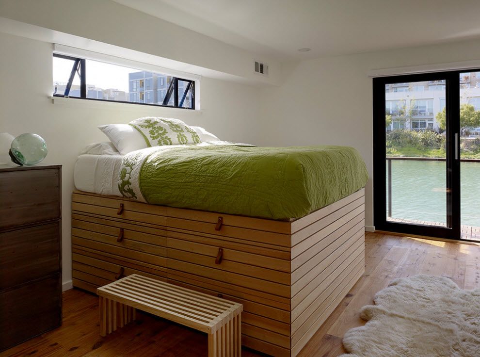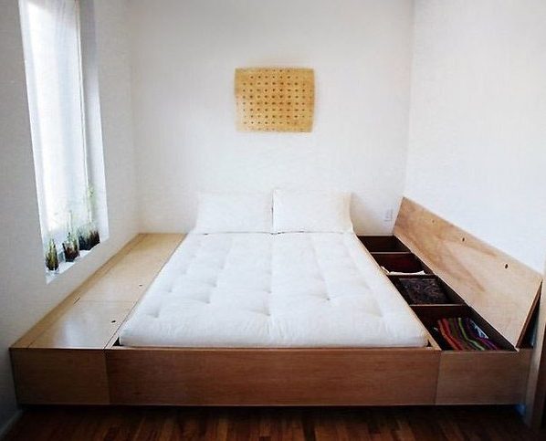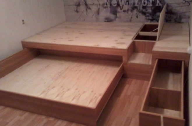 - توفير الفضاء. يتم تحقيق ذلك نظرًا لحقيقة أن منصة المنصة تجمع بين العديد من الوظائف ، مما يزيد من المساحة المفيدة. يمكن أن تبنى صناديق للكتان ، أرفف للكتب أو أشياء أخرى.
