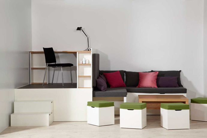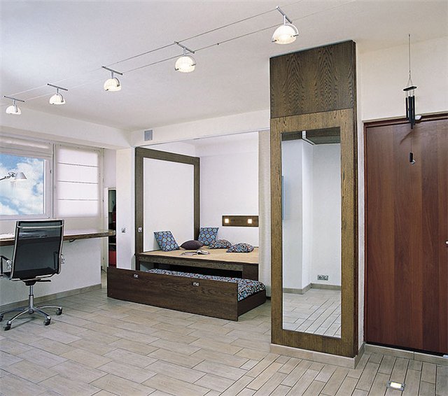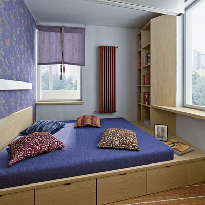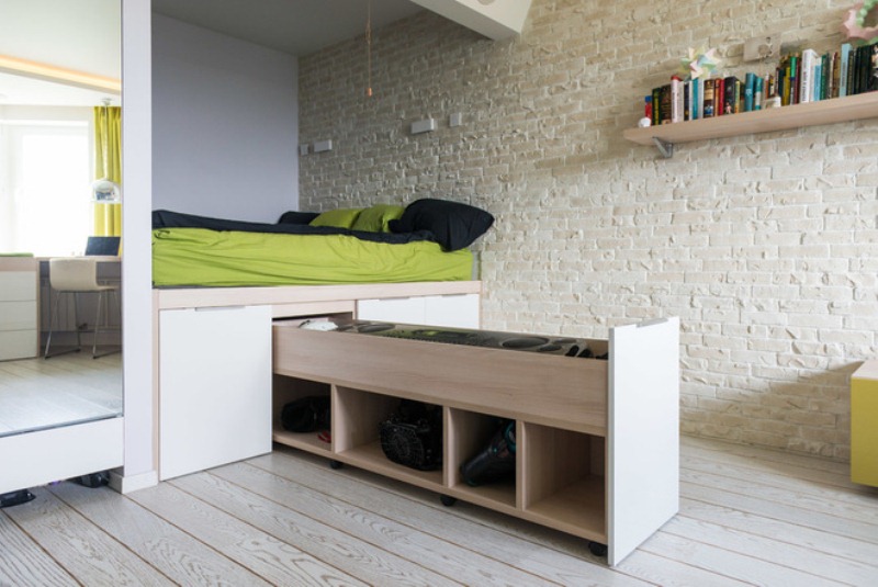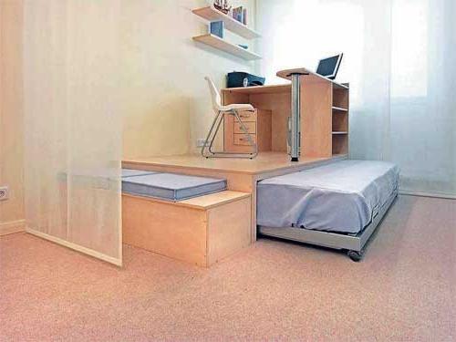 يمكنك التحدث عن معايير مثل استخدام المنصة. هذا يشير إلى موقع السرير. يمكن أن يكون موجودًا في أعلى المنصة ، ويتم تمثيل المساحة الإضافية المفيدة بواسطة المنصة ، والتي يمكن استخدامها كصناديق تخزين. الخيار الثاني هو سرير قابل للطي.