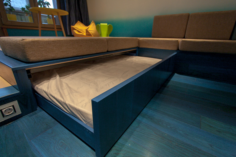 في حالتنا ، تفاصيل إضافية هي الأدراج. هذا هو خيار عملي جدا وسهلة الاستخدام. يمكنك أيضًا إنشاء أدراج بأبواب أو أرفف مفصلية. ومع ذلك ، فإننا ننصح باستخدام الأدراج.