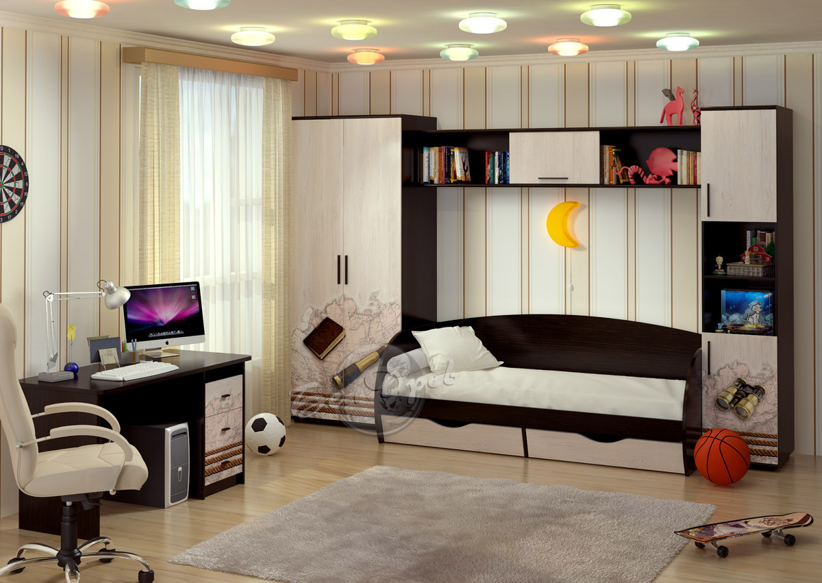يمكن تجهيز سرير لطالب في المدرسة ، حيث يعتمد حجم السرير على عمر الطفل ، بأدراج لتخزين الأشياء والفراش.