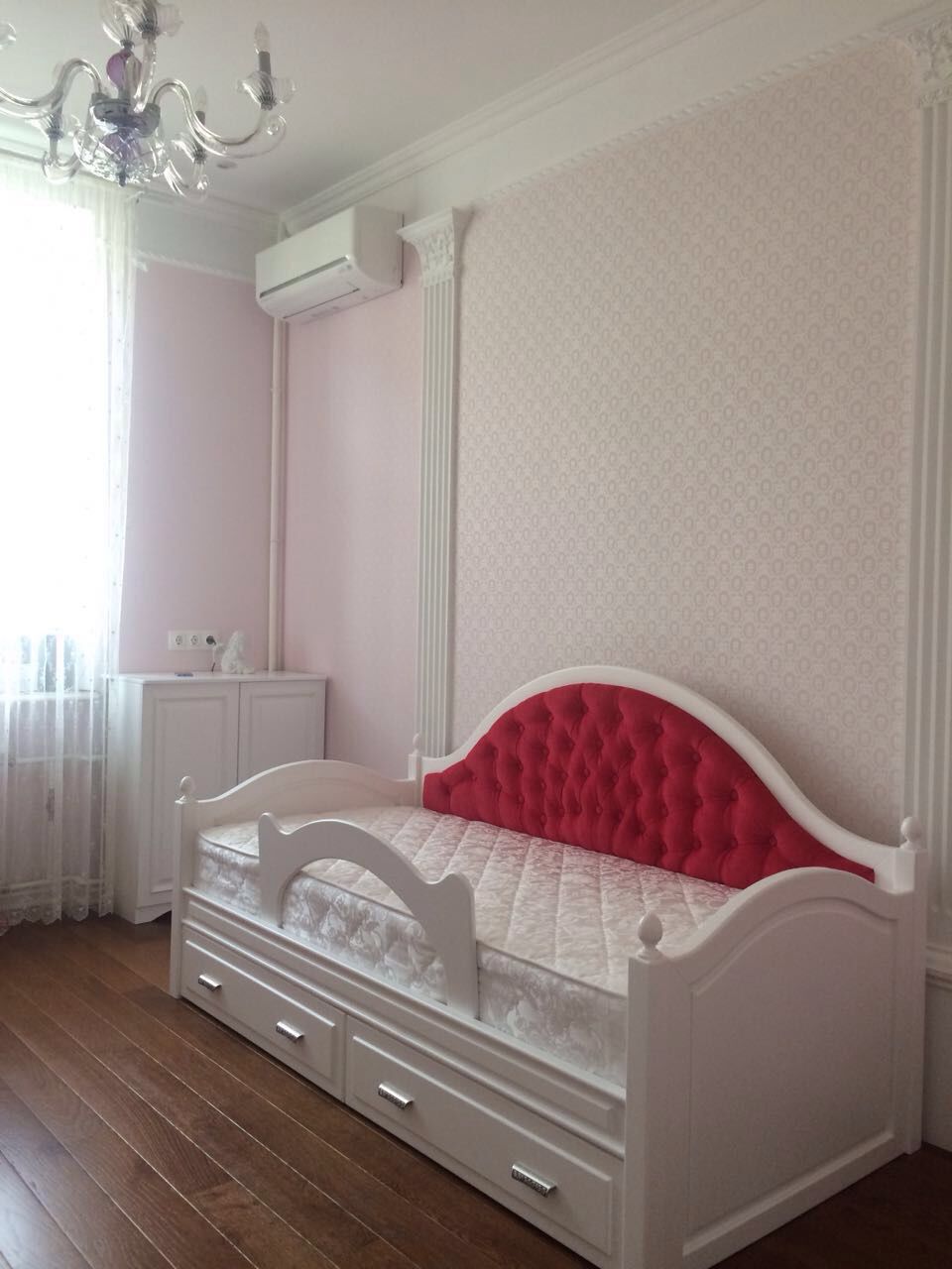 هناك حاجة إلى سرير تحويل مصنوع من الخشب الصلب أو الألواح الخشبية المرققة بين الوالدين: يتم تثبيت روضة على قاعدة طويلة ، ويوجد صندوق من الأدراج مع طاولة تغيير بجانبه.يبلغ حجم روضة السرير القياسية 120 * 60 سم ، وعندما يكبر الطفل ، يتم تفكيك روضة الأطفال ، ويوضع خزانة ذات أدراج على الأرضية ، ويزيد حجم السرير - 180 * 60 سم ، ويتم الحصول على سرير مراهق كامل. بالإضافة إلى أدراج الخزانة ، قد يكون هناك لفة أسفل السرير.