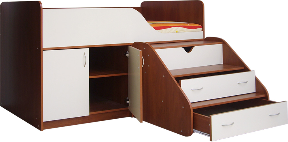 في هذا التصميم للسرير ، من الممكن وضع صناديق تخزين ليس فقط أسفل الجزء السفلي ، ولكن أيضًا على الجانب السفلي عند سفح السرير. يمكن وضع الصناديق على درجات السرير أو عند سفحها على ارتفاع كامل. ستكون حجرة السرير مناسبة لغرفة صغيرة الحجم ، حيث لا يمكن وضع خزانة ملابس كاملة للأشياء. يبقى حجم السرير دون تغيير ، ويمكن وضع الأدراج والخزائن في أسفلها أو جانبها.