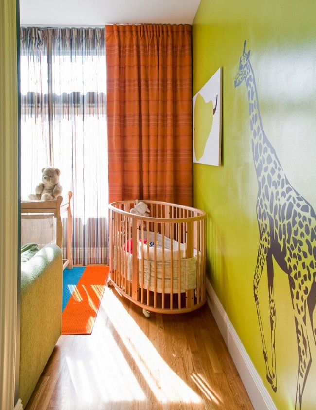 غرفة مشرقة للأطفال مع سرير خشبي لحديثي الولادة.