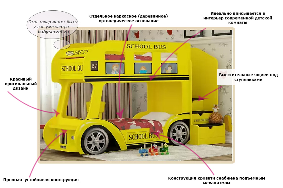 نموذج "لندن" بمثابة زخرفة رائعة من الداخل للحضانة ومناسبة للأطفال من أي جنس. في مجموعة متنوعة من المتاجر على الإنترنت ، يمكنك العثور على ألوان مختلفة من هذا السرير. إن جوانب حافلة النوم مصنوعة من البلاستيك مع ملصقات مغلفة بالبوليمرات أو صور فوتوغرافية. هذا الطلاء يقاوم الخدوش والصدمات. في بعض الأسرة ، تدور العجلات ، مما يخلق حاشية إضافية يحبها الأطفال كثيرًا.