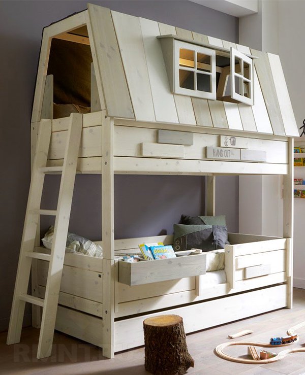 على الديكور يستحق النظر قبل بدء الإنتاج ، لأنه قد يؤثر على المشروع. للحرفيين ذوي الخبرة تحت القوة لصنع الأثاث في شكل منزل أو سيارة أو قارب. يمكنك إرفاق "الفروع" بدلاً من الدرج ، والتي سيصعد عليها "الشباب ماوكلي" إلى الطابق الثاني.
