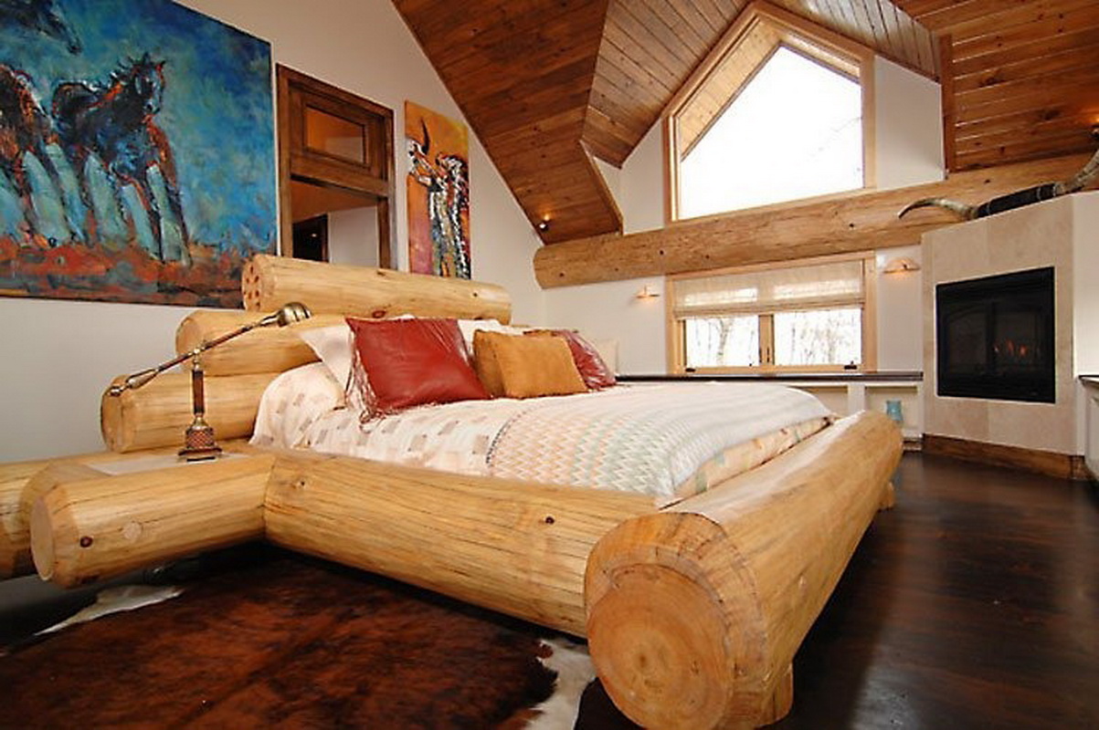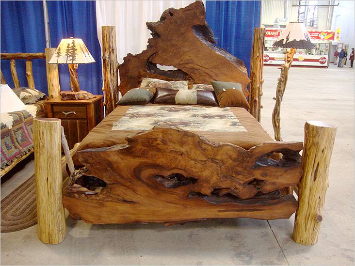 سرير خشبي محلي الصنع مع ظهر من قطع جذع الشجرة