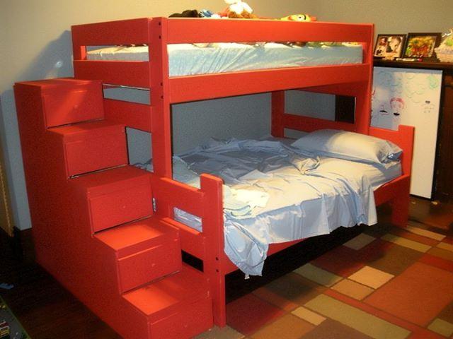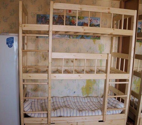 سرير خشبي بطابقين مع رصيف مزدوج - حل جيد لاستيعاب ثلاثة أشخاص