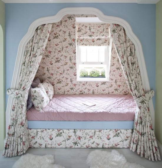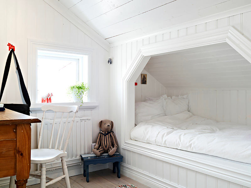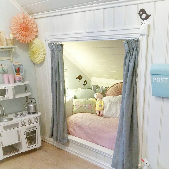 فتحات جميلة في الحائط ، مصنوعة على شكل منازل ذات أسطح مثلثة للأسرة في غرفة البنات