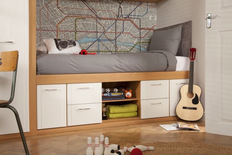 يمكن صنع المنصة في غرفة النوم أو غرفة المعيشة مع سرير قابل للطي على عجلات