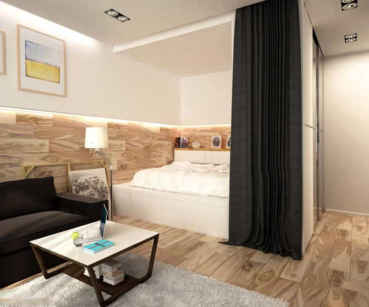 تزيين شقة استوديو مع الأثاث الخشب الرقائقي المدمج في