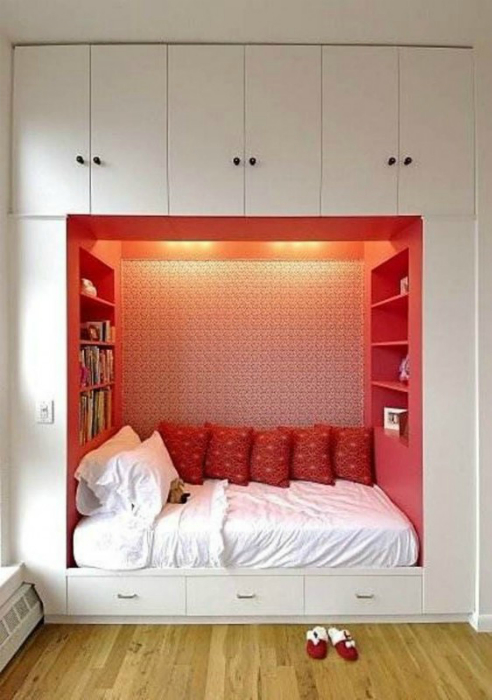 بالإضافة إلى الجمال والبساطة والراحة والقدرة على ترتيب الأرفف والأدراج والكتب وخزانات الملابس والخزائن (دون فقدان المساحة "الفارغة" في المنافذ) ، هناك أيضًا فرص كافية لحلول التصميم وتخصيص مساحة السرير من مساحة الغرفة الرئيسية.