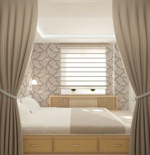 وضع سرير في مكان كهذا سيكون مثالياً في نهاية الغرفة ، بالقرب من الحائط مع نافذة. عند وضع سرير أعلى المنصة (أو منتصف المنصة) ، من المريح وضع جانب السرير في النافذة ، ولكن ليس قريبًا جدًا ، حيث أنه في الطقس البارد يكون التبريد من النافذة ممكنًا (وفي الوقت نفسه ، تكون الحرارة الزائدة من البطارية) مثالي في هذه الحالة هو ترك مساحة لطاولة بجانب السرير أو مجرد ممر صغير. هذا الخيار مناسب للعيش كزوجين في شقة ، وللعائلات التي لديها طفل.