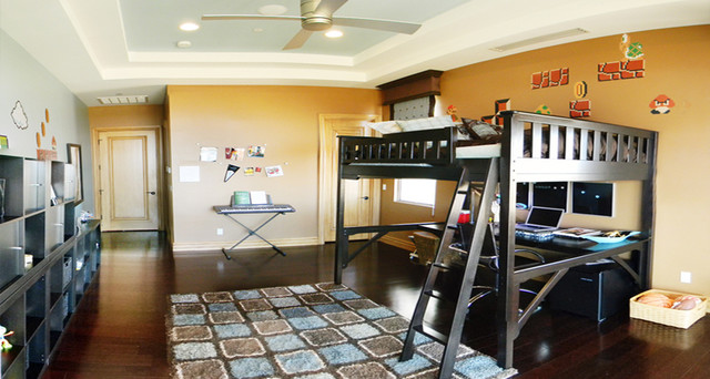 غرفة نوم على طراز لوفت مع سرير مرتفع وخزانة ملابس في الطابق السفلي