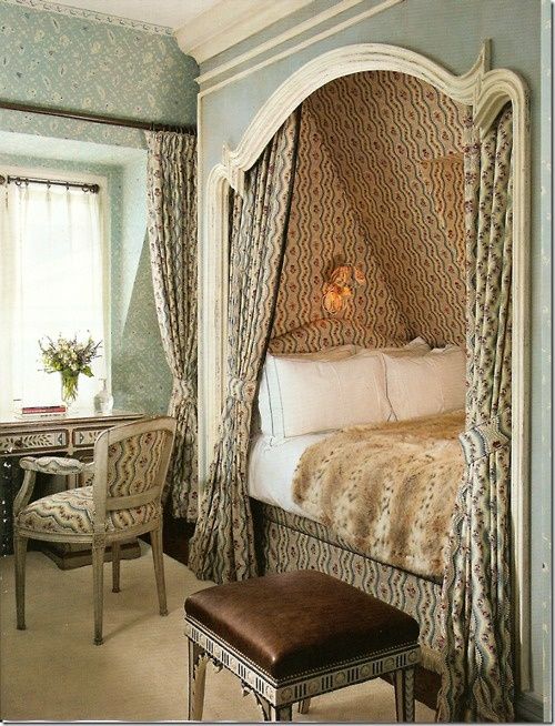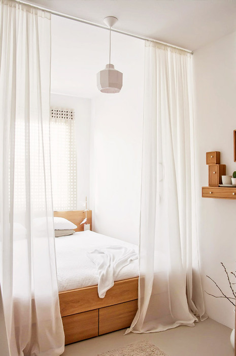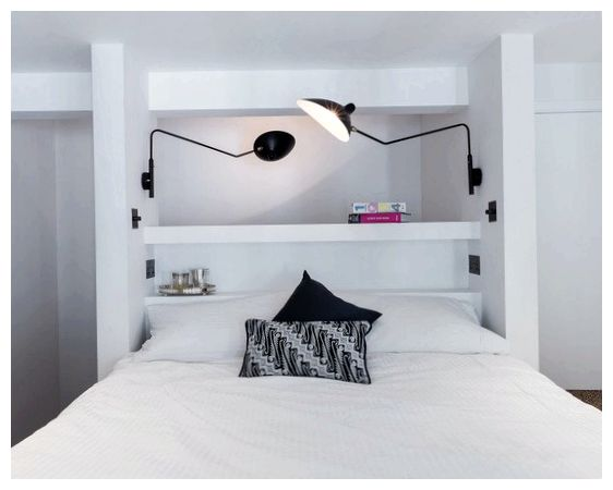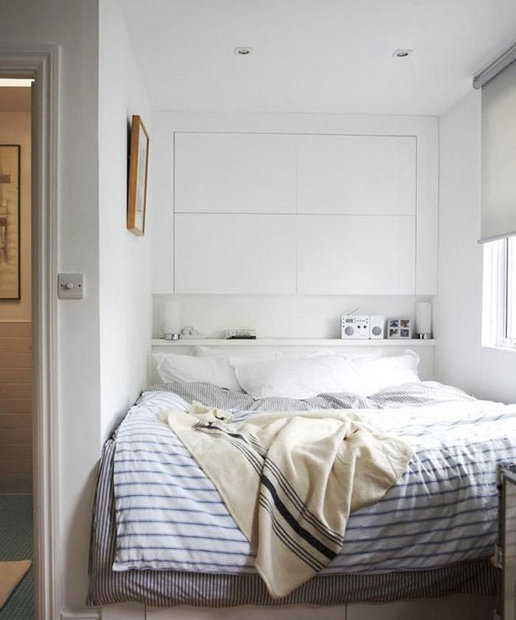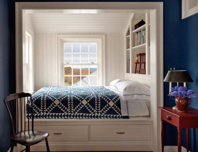 استخدام مكانة عميقة مع السرير جوفاء تقريبا في الطول أو العرض. لمحبي مكان منعزل للنوم ، والذي يمكن تسويته بواسطة ستارة وحتى باب ، سيكون حلاً رائعًا لإنشاء مكان عميق للسرير.