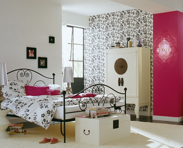 يبدو أن غرف النوم هذه مصممة بأسلوب رومانسي فاتح.