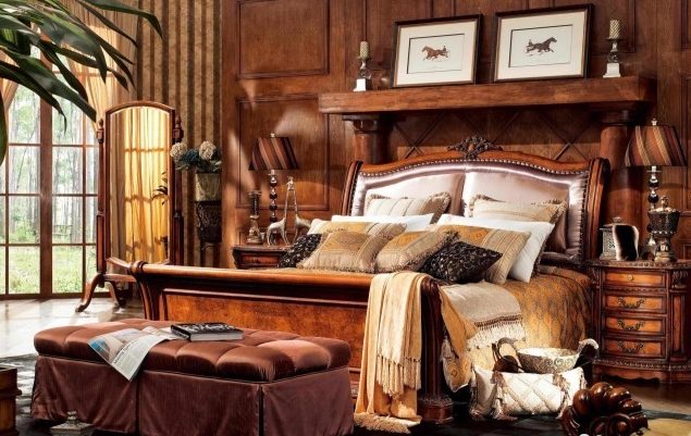 غرفة نوم فاخرة مع أثاث خشبي باهظ الثمن على الطراز العتيق.