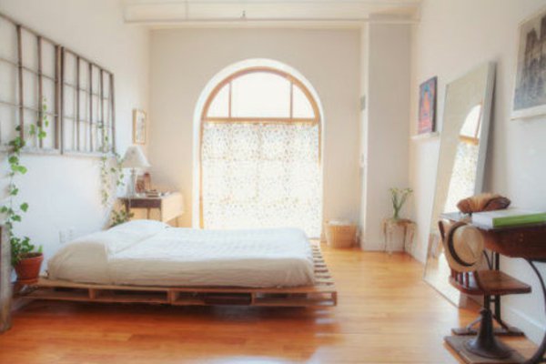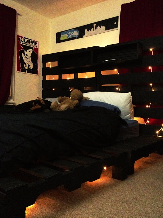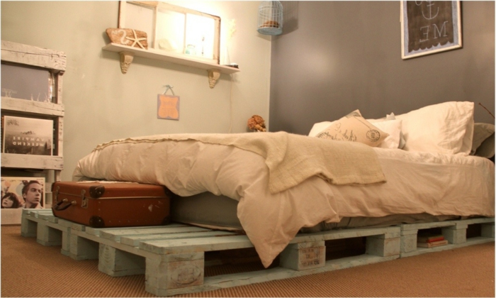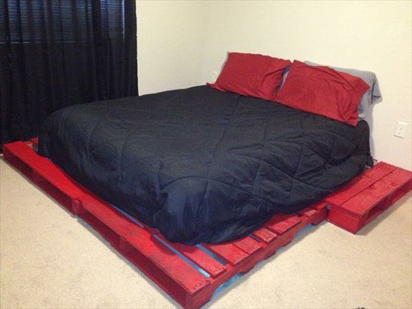 السرير الأصلي والميزانية من المنصات جاهزة! يمكن استخدام الجزء البارز من البليت كطاولة بجانب السرير.