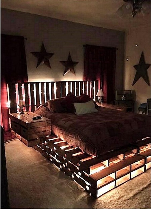 يتم تحويل المنصات الخشبية الخشنة وغير المعالجة إلى سرير رومانسي للبالغين بمساعدة مواد التشطيب المختلفة.